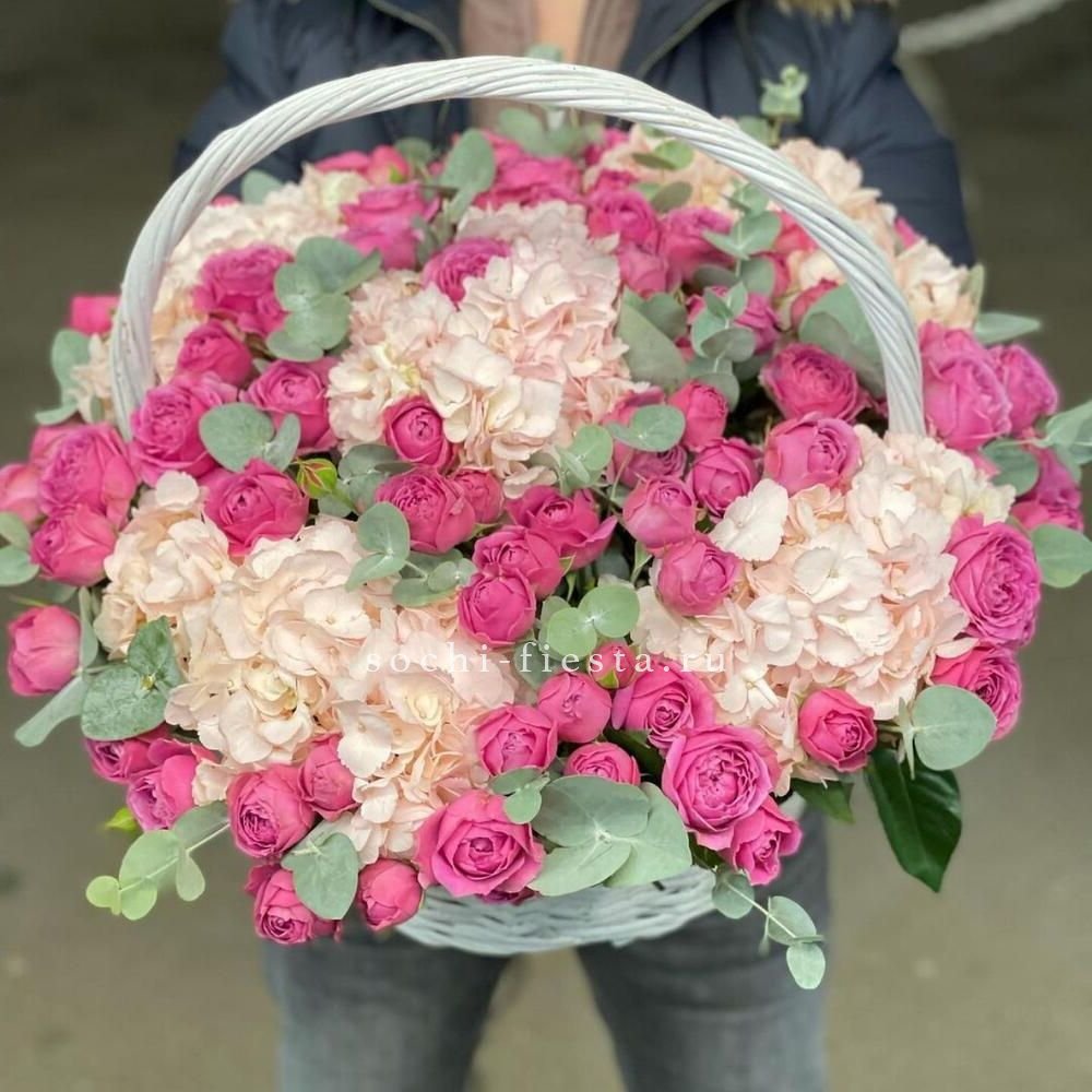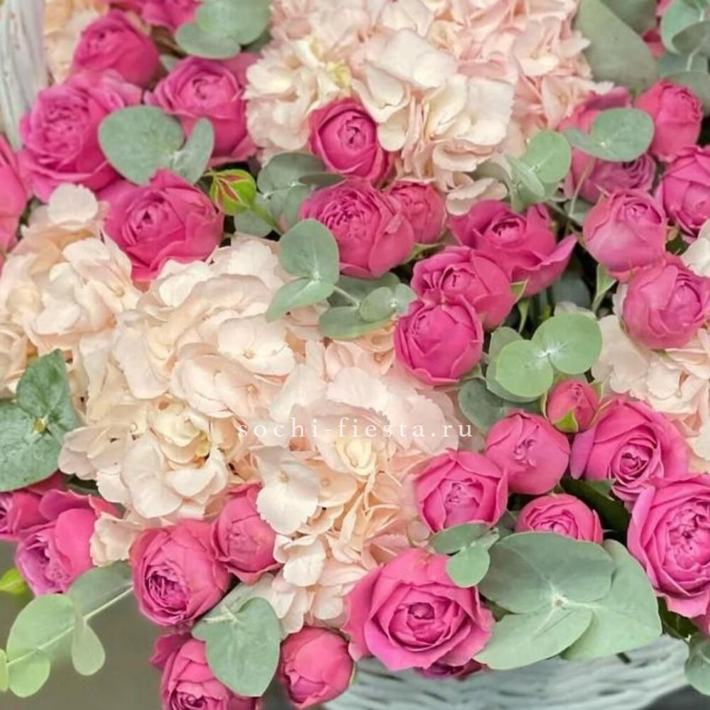 Здесь идеально сочетаются крупные, бархатистые бутоны роз, облака гортензии и мелкие акцентные цветы. Получилась невероятно воздушная и легкая композиция, которая мгновенно создает ощущение праздника и весеннего настроения. Стильный бант завершает этот изысканный образ.
