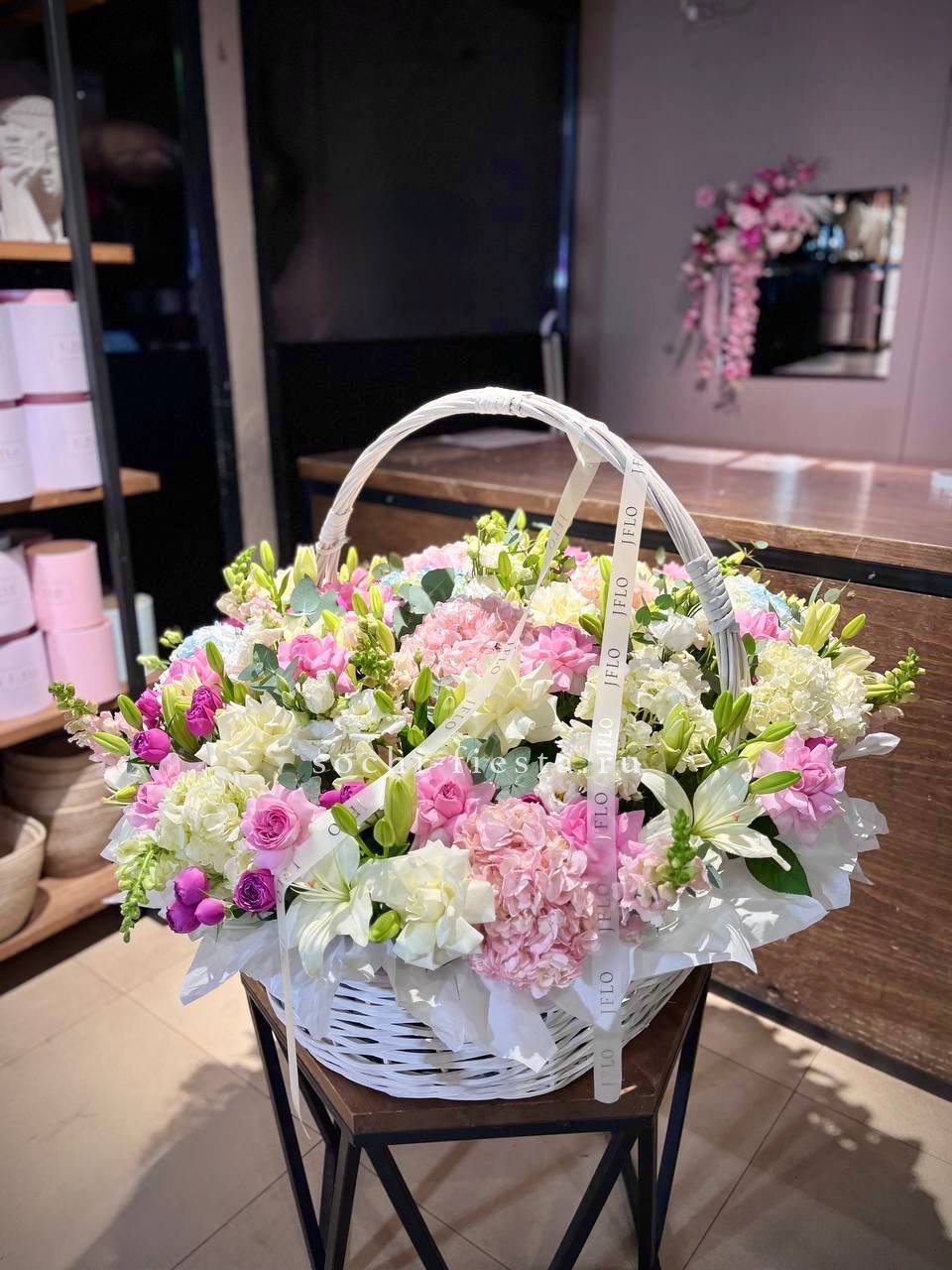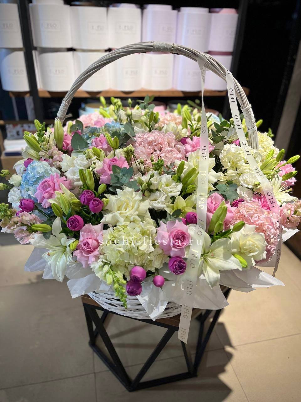 Пышная композиция в плетеной корзине объединяет розы, гортензию, эустому и дельфиниум в единую объемную форму. Маттиола и бомбастик добавляют воздушности, а эвкалипт создает мягкий природный фон. Корзина удобно располагается на любой поверхности и держит форму без дополнительной опоры.