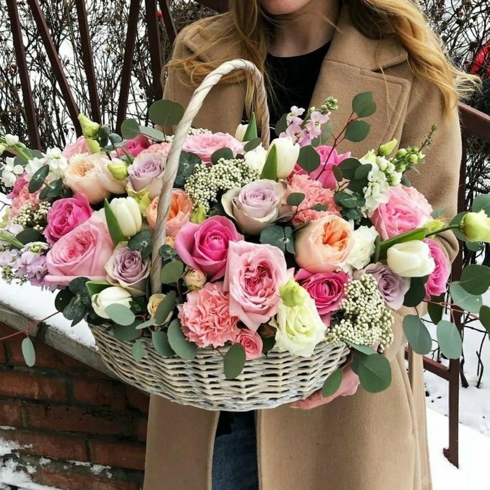 розы одноголовые, диантусы, роза пионовидная, тюльпаны (в сезон или аналог), маттиола, эустома, эвкалипт, декоративная трава, озотамус корзина D40.
