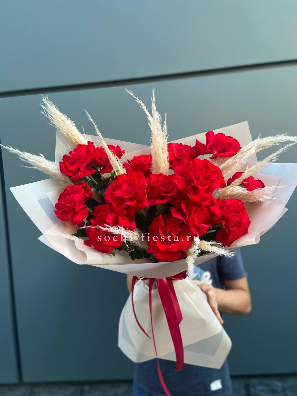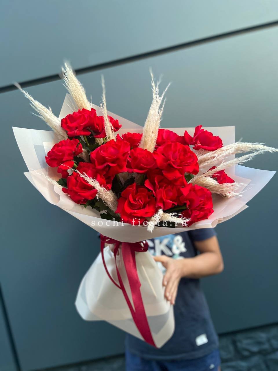 розы, гортензия, пионовидные кустовые розы, эустома, диантус, монстера, хамелациум, эвкалипт, лента, фоамиран, плёнка.