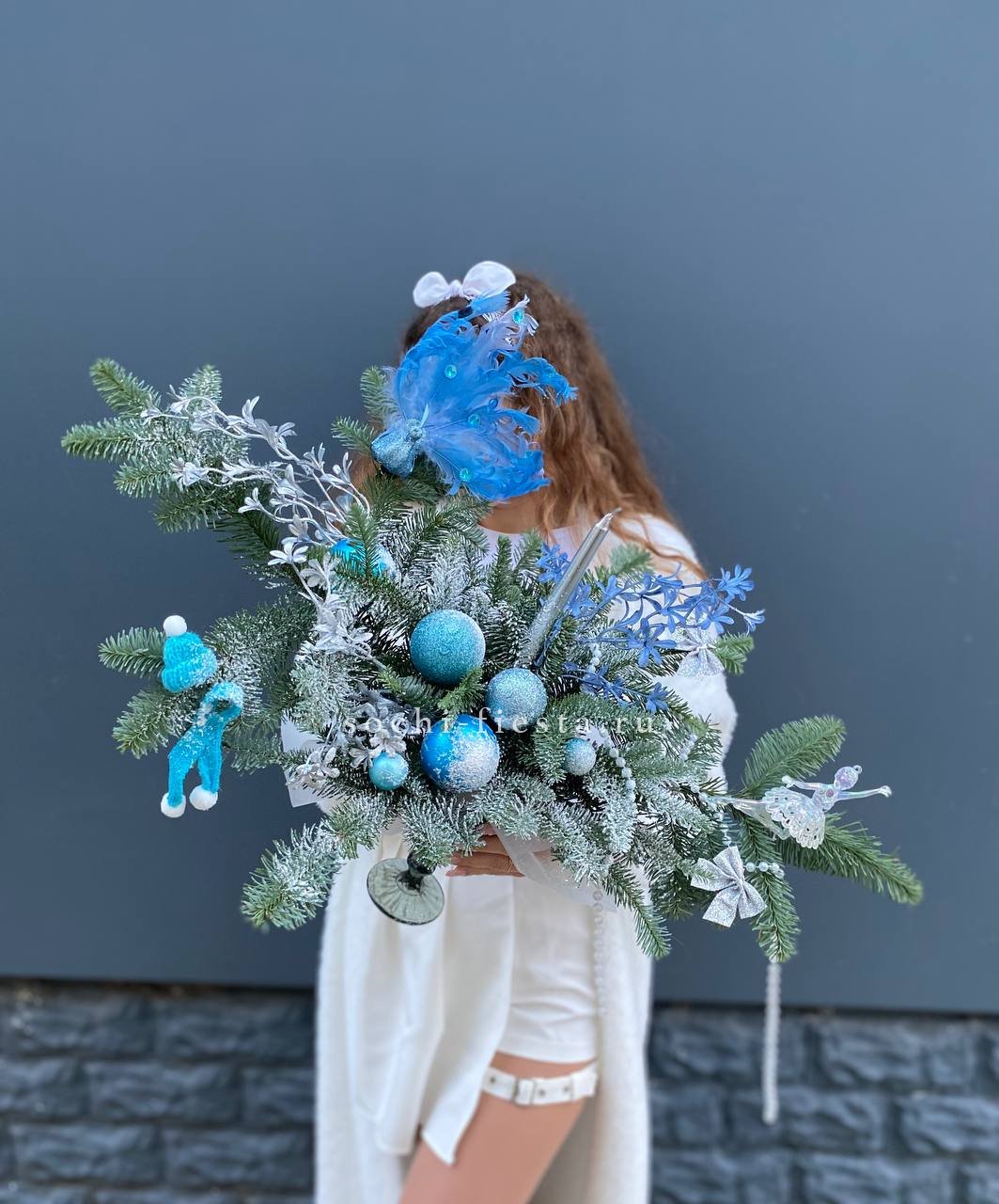 Голубые оттенки декора в сочетании с зеленью нобилиса раскрывают морозную палитру зимы. Свеча в прозрачном бокале добавляет лёгкости и света небольшой настольной форме.