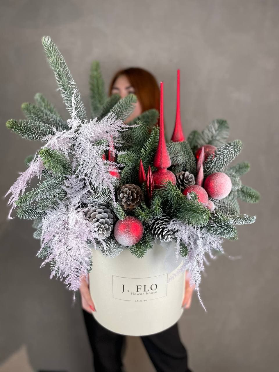 Живая ель нобилиса собрана в форму цилиндра с новогодними игрушками и шишками. Композиция держит форму благодаря оазису и устойчивому боксу. Яркий зимний акцент в интерьере.