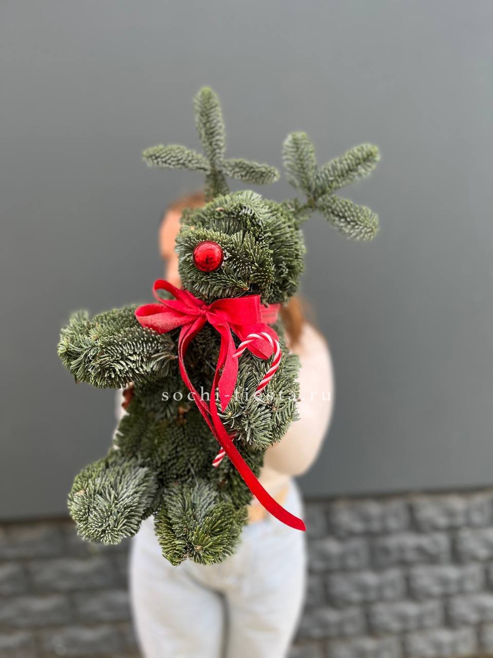 Фигура оленя полностью собрана из веток нобилиса. Объёмная скульптура с выразительным силуэтом заполняет пространство. Живая хвоя создаёт насыщенный зелёный фон для интерьера.