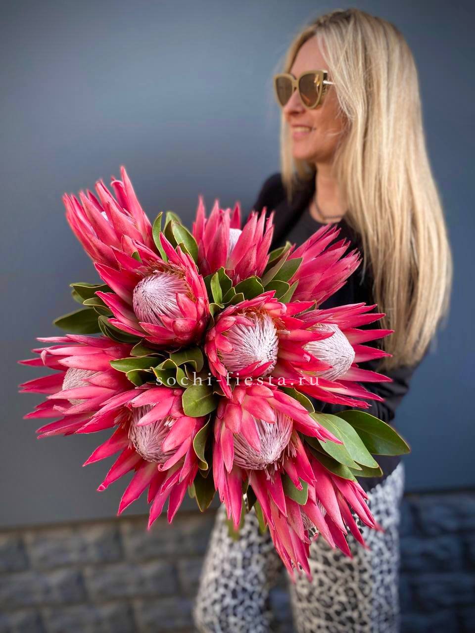 Крупные соцветия с плотными чешуйчатыми лепестками создают графичный акцент в любой композиции. Протея хороша сама по себе и эффектна в сборных букетах.