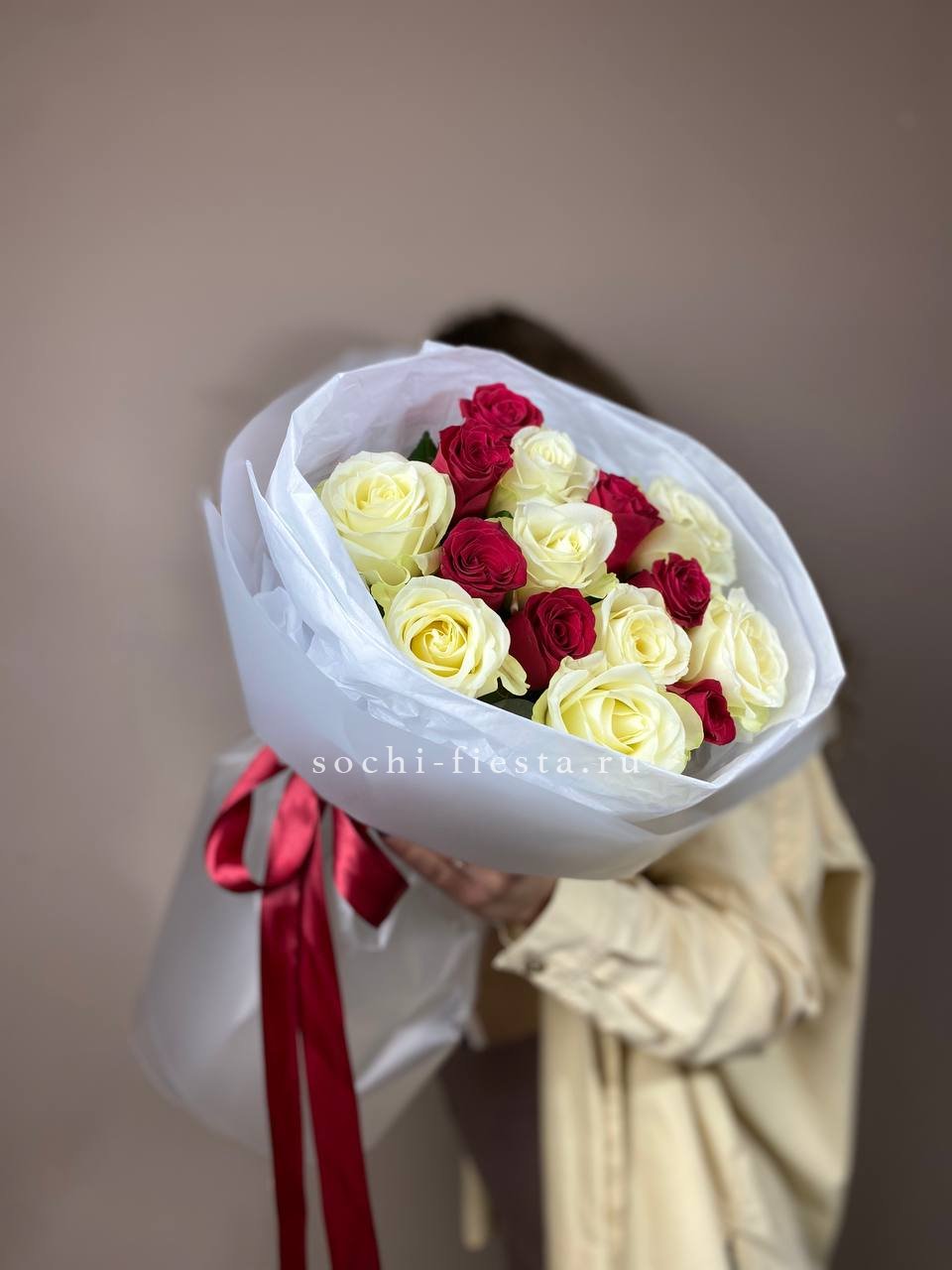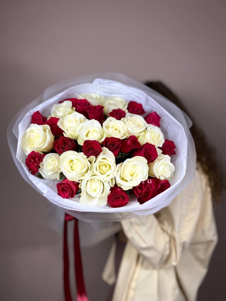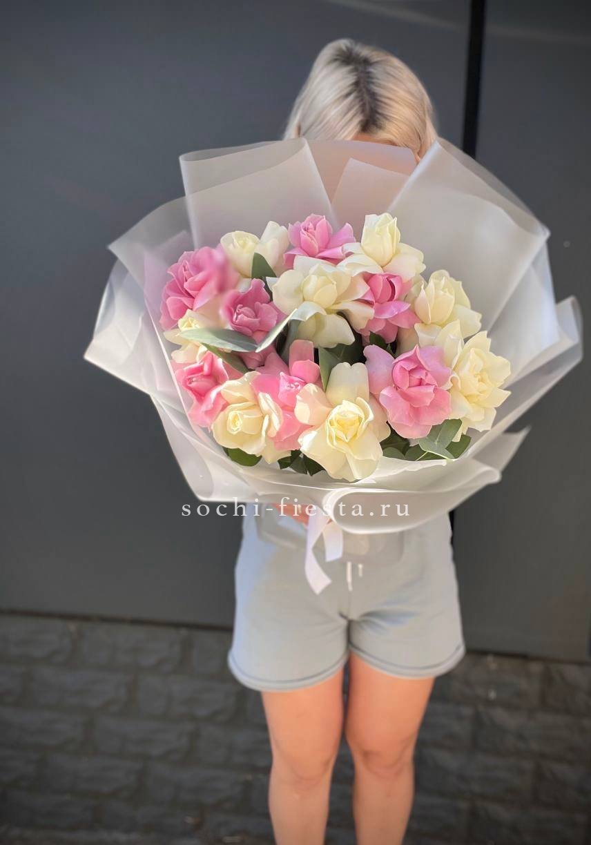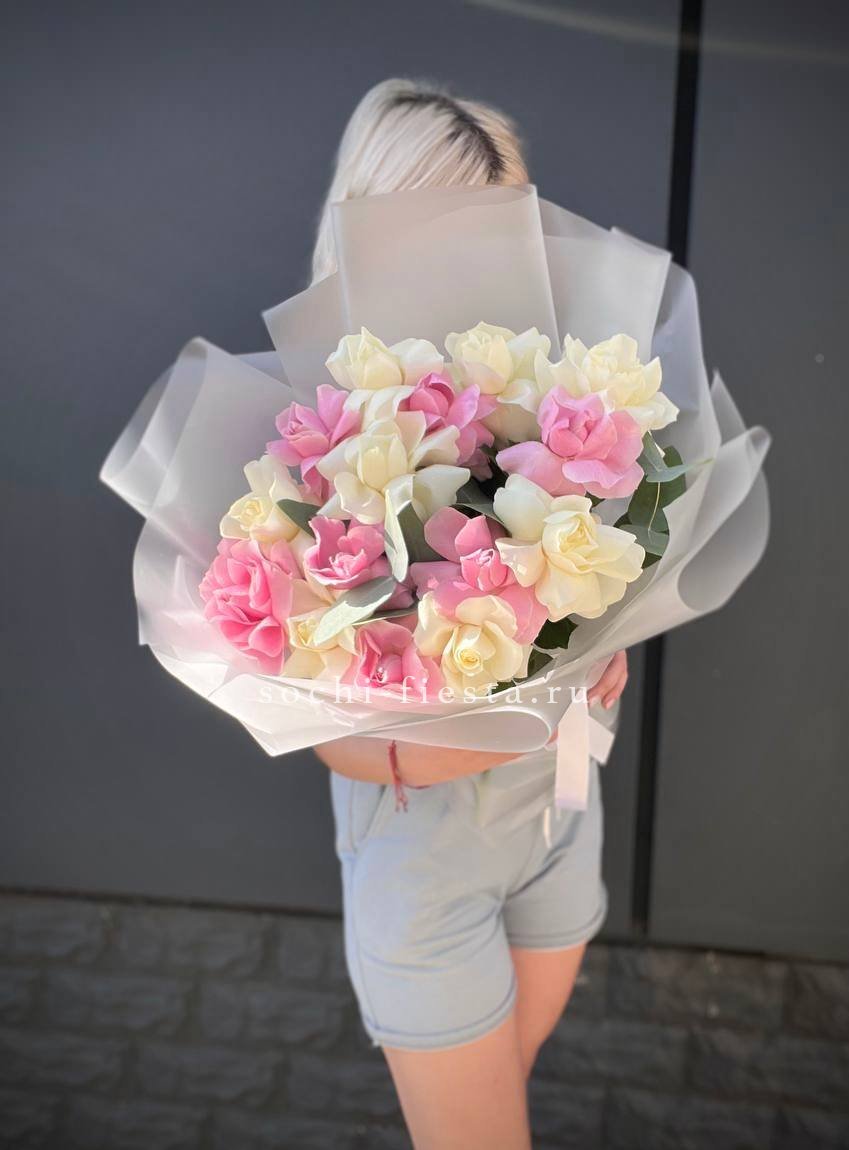 55 роз белого и розового оттенков или же с добавлением кремовой розы, лента, упаковка.