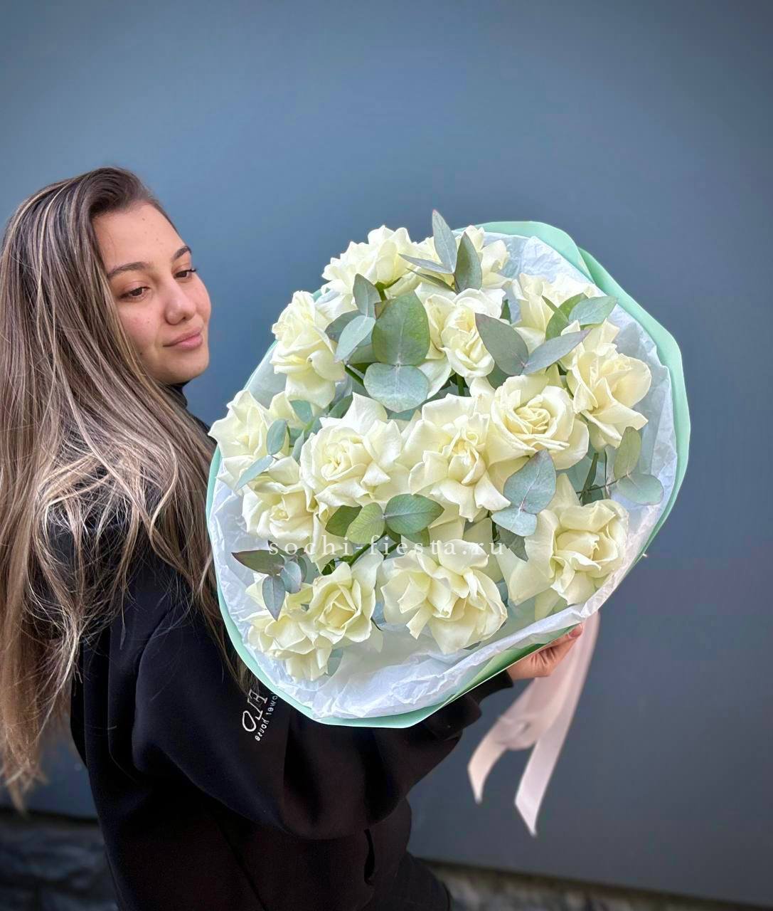 Французские розы Notte Bianca раскрываются широкими вывернутыми бутонами с фактурной глубиной. Эвкалипт добавляет графичности и подчёркивает архитектуру каждого цветка.