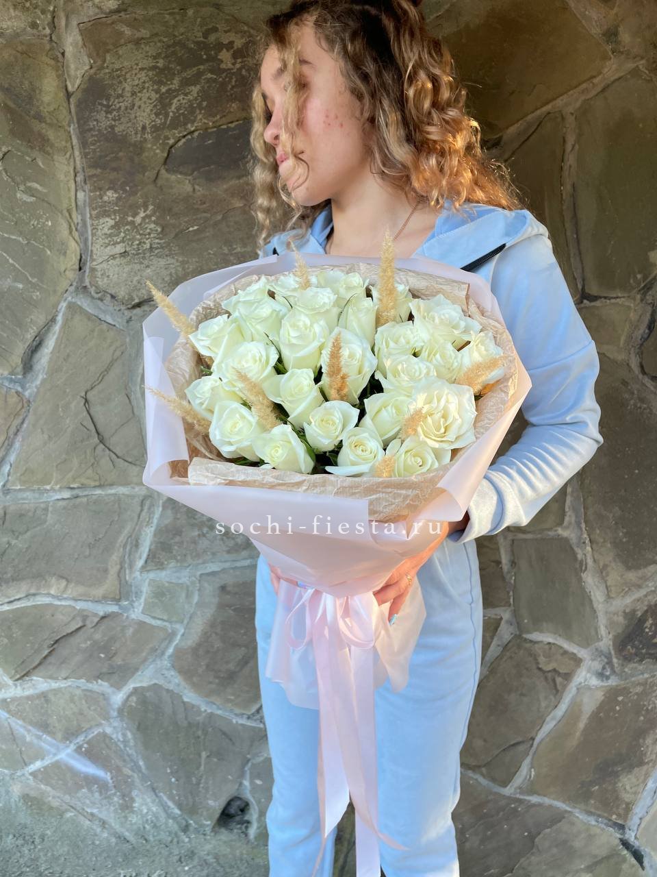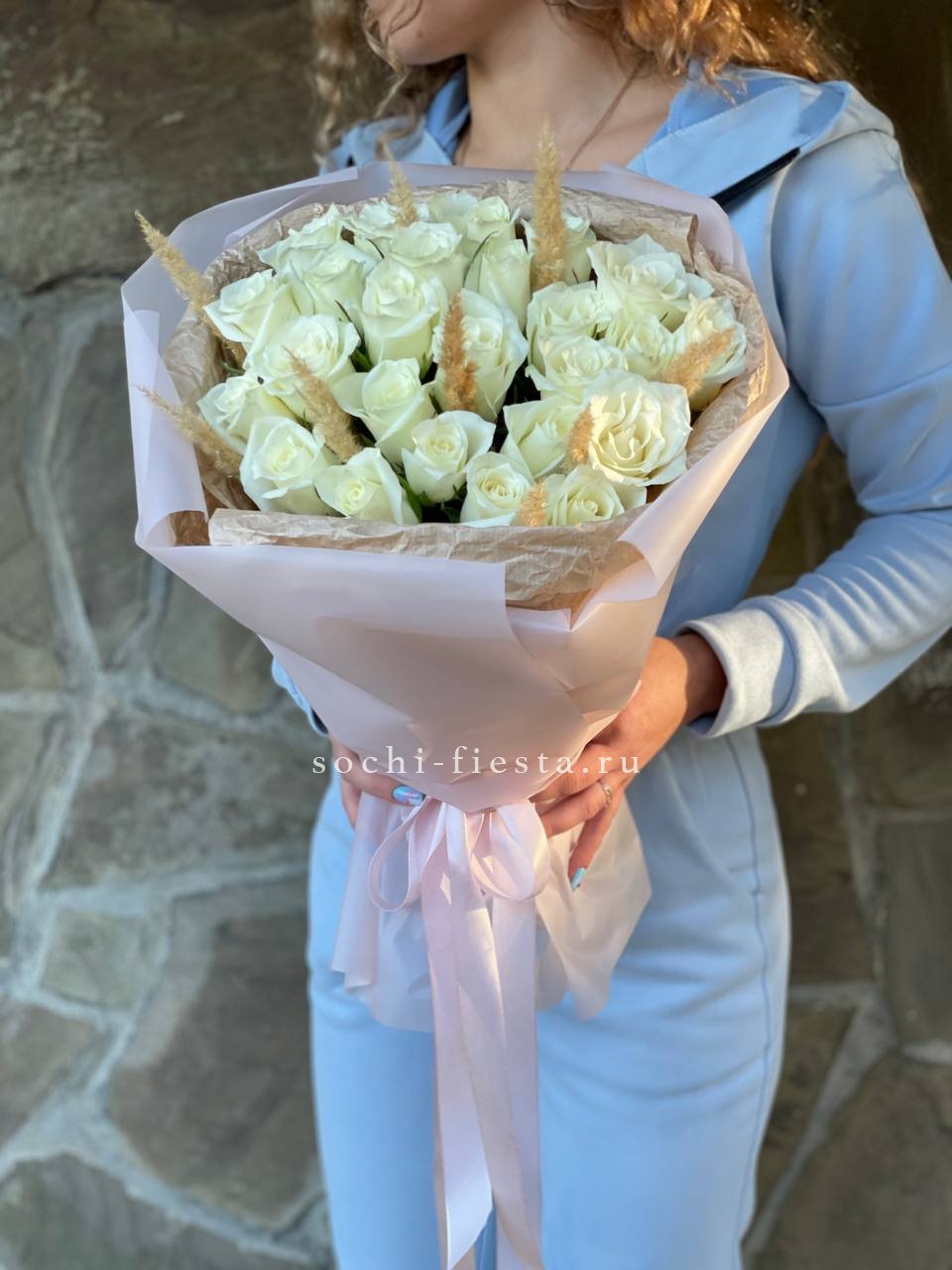 белые розы 35 шт., лента, упаковка на выборВы можете выбрать любое количество.