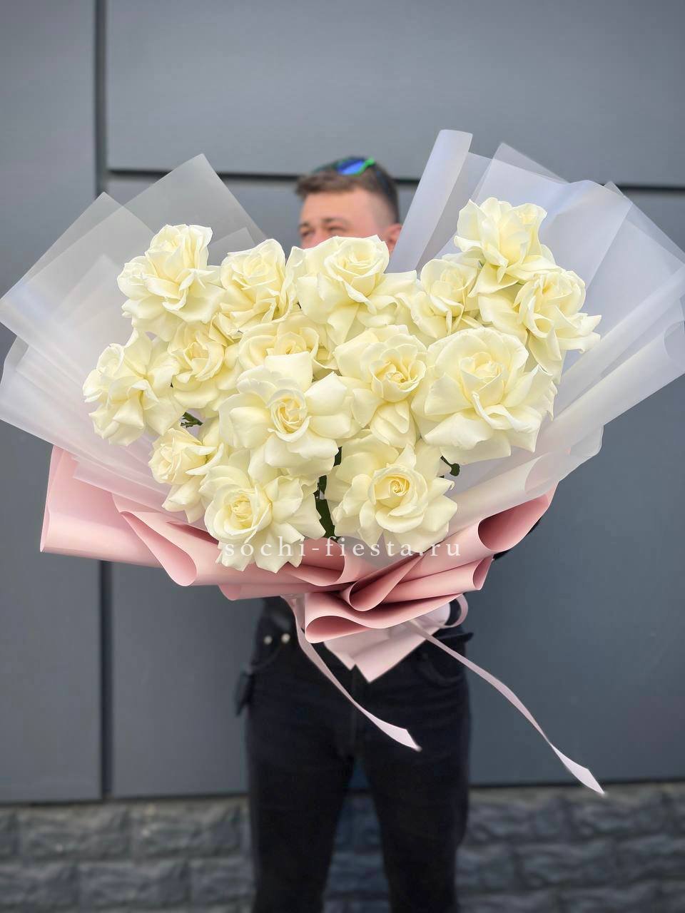 Тридцать девять бутонов образуют плотную белоснежную сферу. Каждый цветок раскрывается постепенно, сохраняя свежесть и форму на протяжении многих дней. Классика в чистом виде.