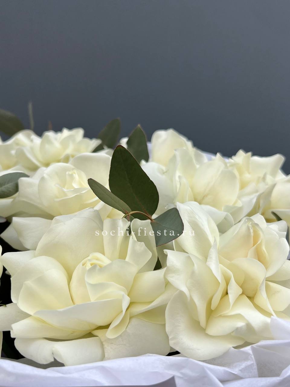 9 белых роз, декоративная зелень, дизайнерская упаковка.