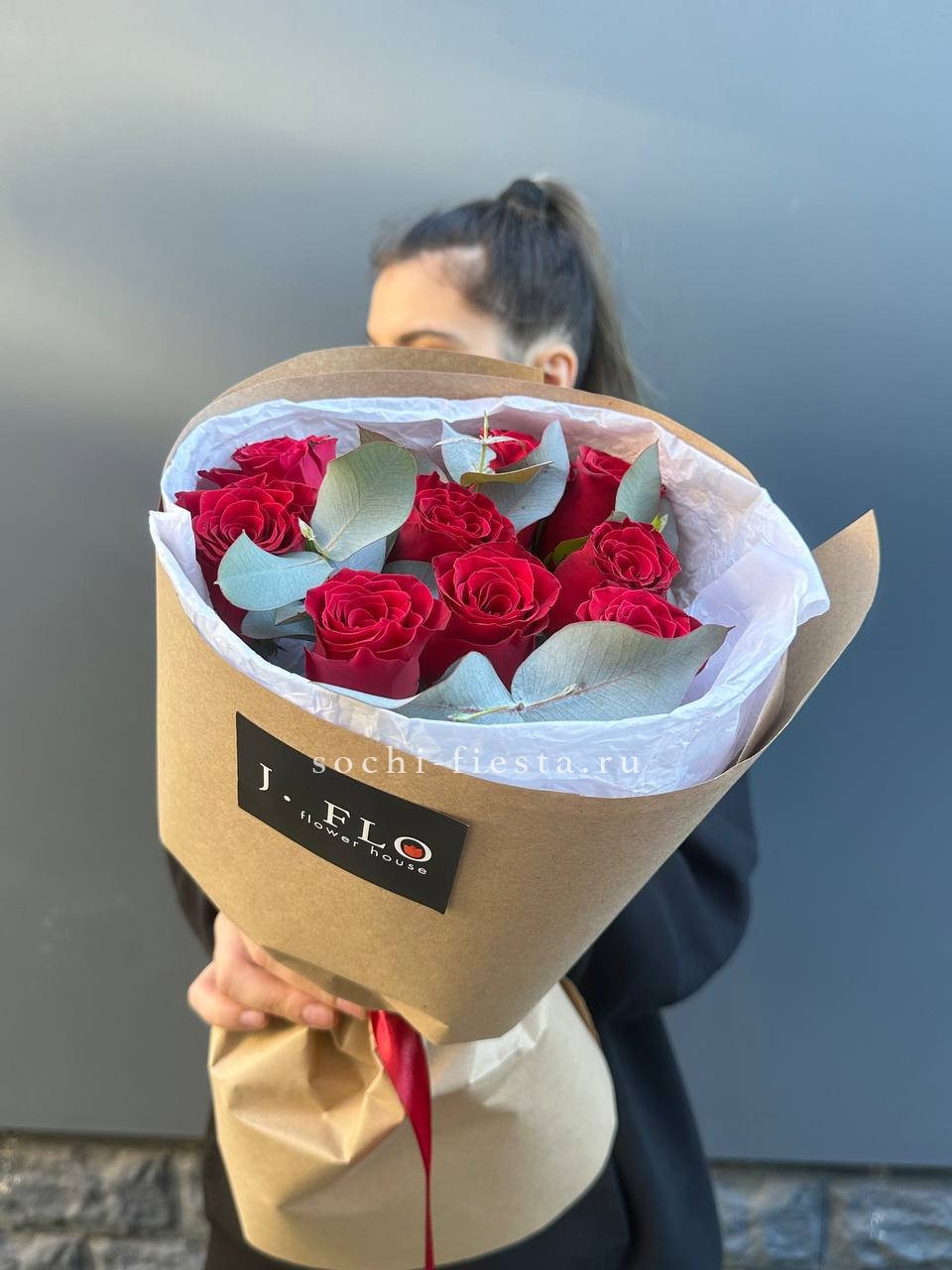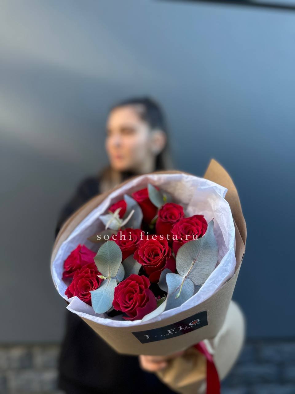 Классическая красная палитра раскрывается в композиции из двадцати пяти роз с добавлением эвкалипта. Матовая зелень оттеняет насыщенность бутонов и придает букету завершенность.