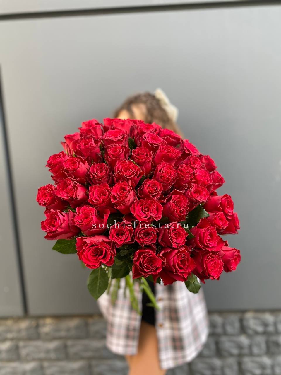 Красный монохром из пятидесяти одной розы притягивает взгляд своей насыщенностью. Крупная композиция заполняет пространство и создает яркое визуальное впечатление.