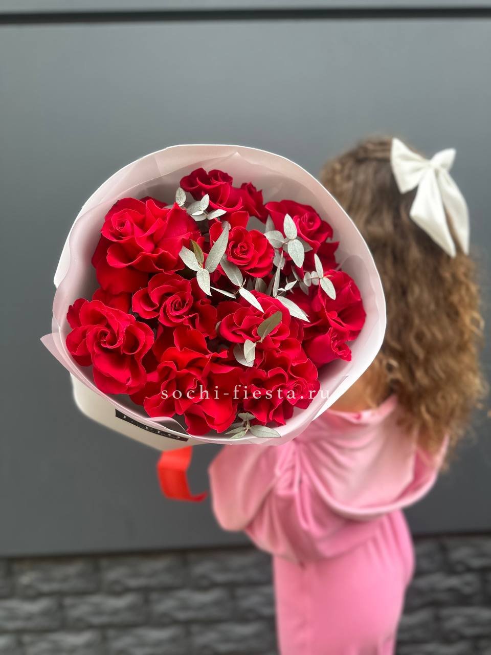 Красные розы образуют rounded форму с равномерным распределением бутонов. Фоамиран добавляет мягкую текстуру по краю, создавая завершенную композицию для яркого жеста.