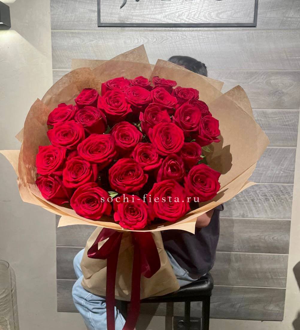 Яркие красные головки роз привлекают взгляд и удерживают его. Цвет насыщенный и живой, букет выглядит выразительно в любом освещении.