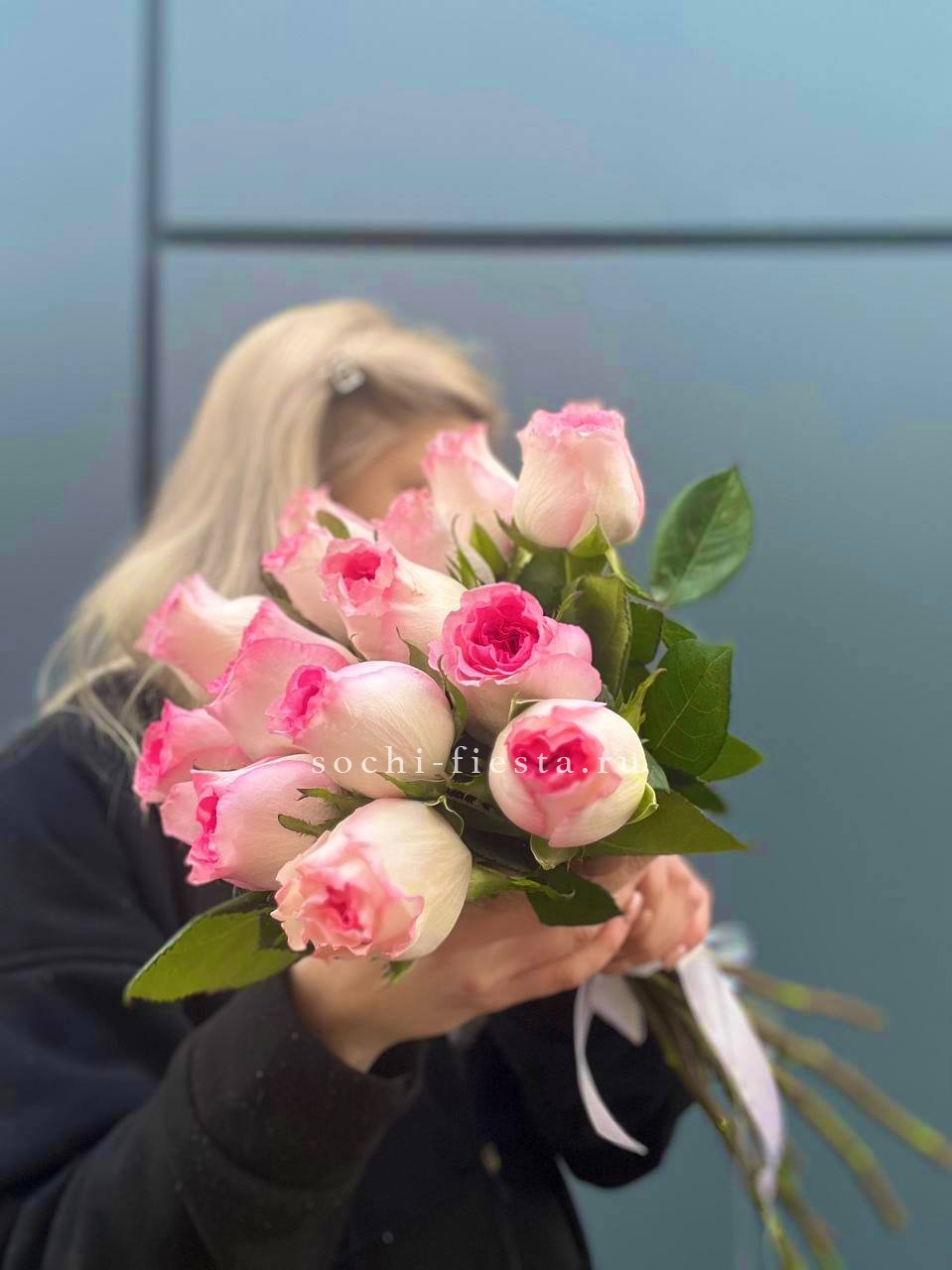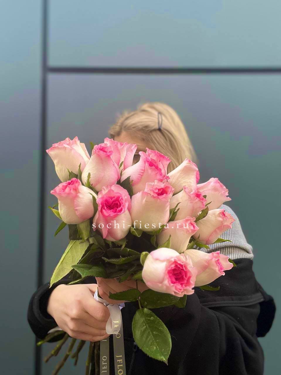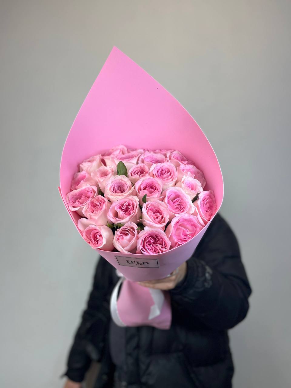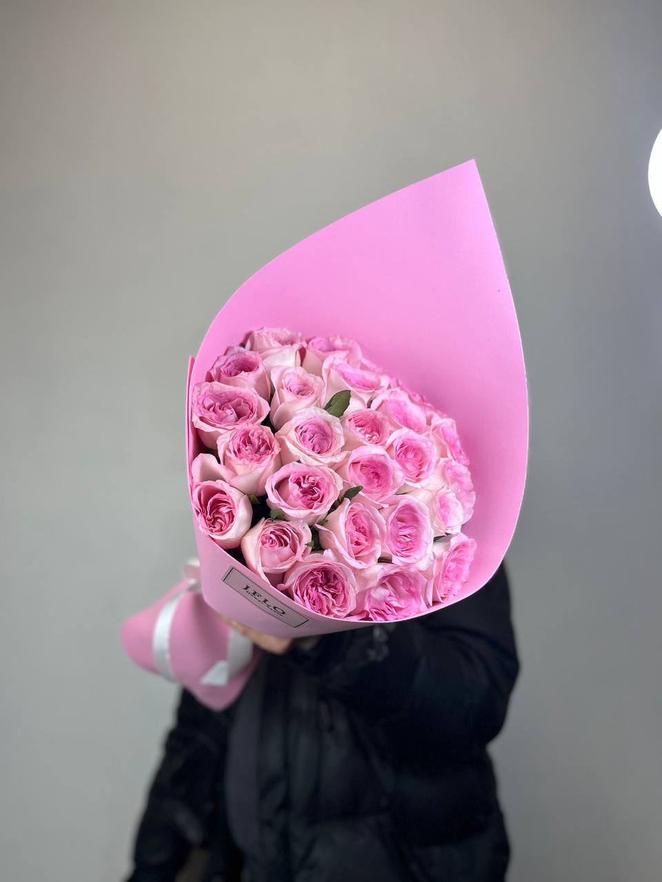 Сорт Mondala привлекает густыми лепестками с белой каймой и насыщенной розовой серединой. Пятнадцать бутонов собраны плотно и раскрываются постепенно. Кенийская пионовидная форма добавляет букету глубину и выразительность.