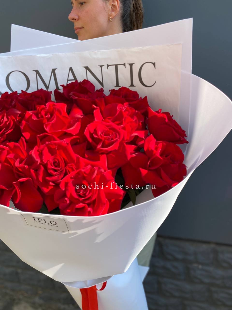 Девятнадцать красных роз с ажурной фактурой лепестков раскрываются постепенно, обнажая глубину каждого бутона. Фоамиран добавляет мягкости силуэту и завершает форму.