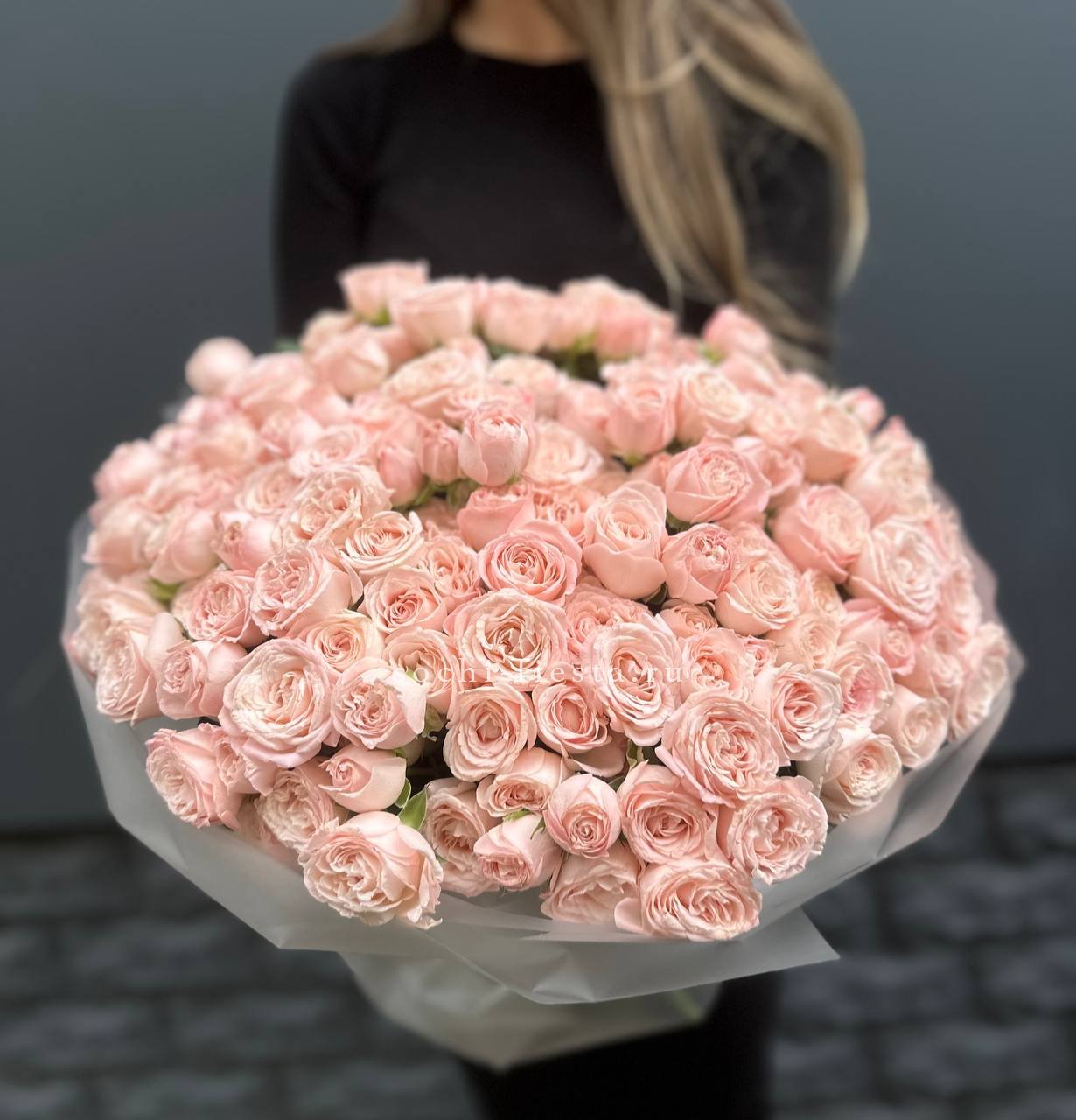 Кремовые кустовые розы сорта Мадам Бомбастик с пушистым лагурусом в дизайнерской упаковке. Многослойные бутоны создают воздушный силуэт. Мягкая пастельная гамма и природная фактура трав формируют спокойный образ.
