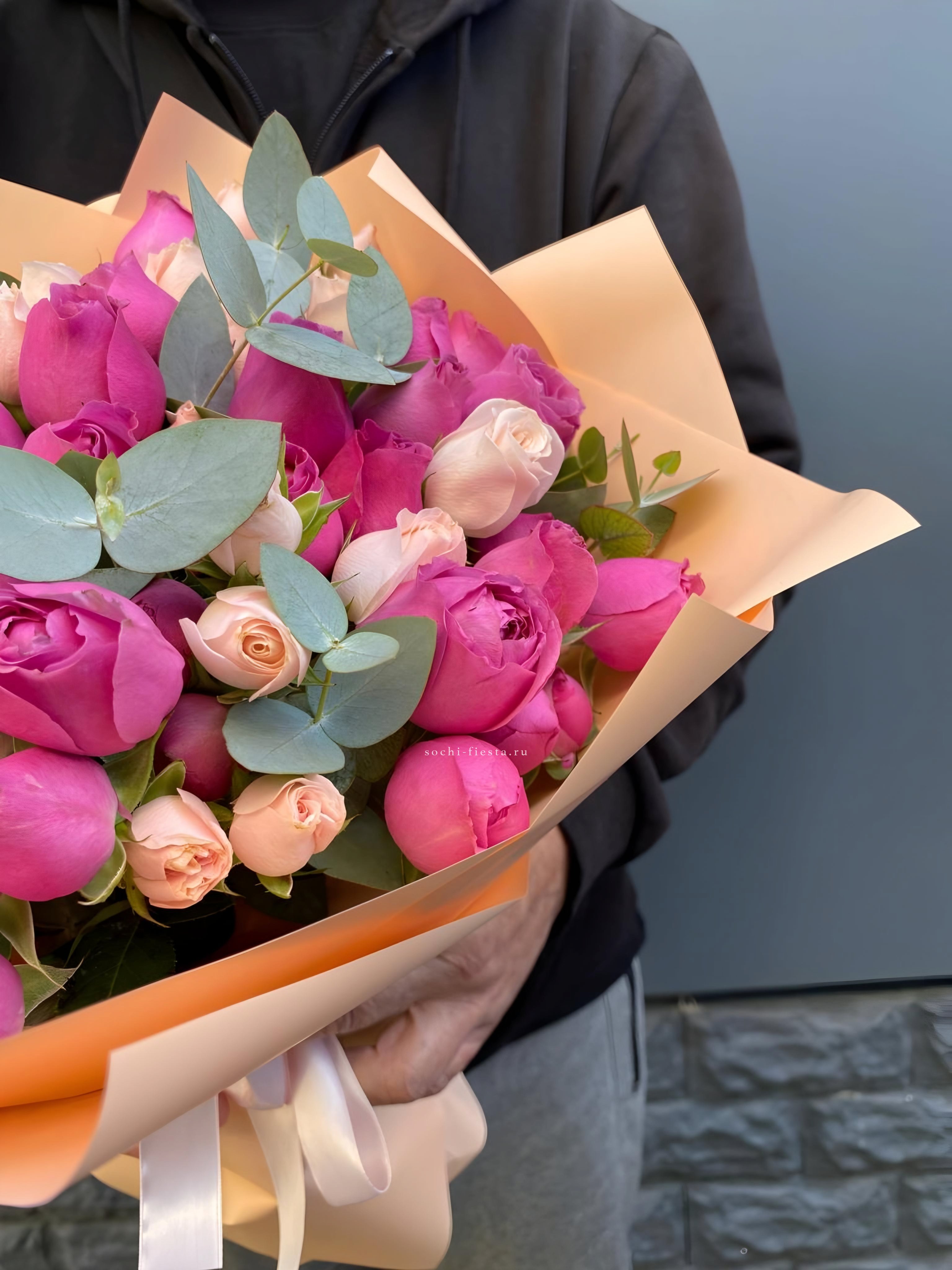 35 пионовидных кустовых роз, лента, дизайнерская пленка.
