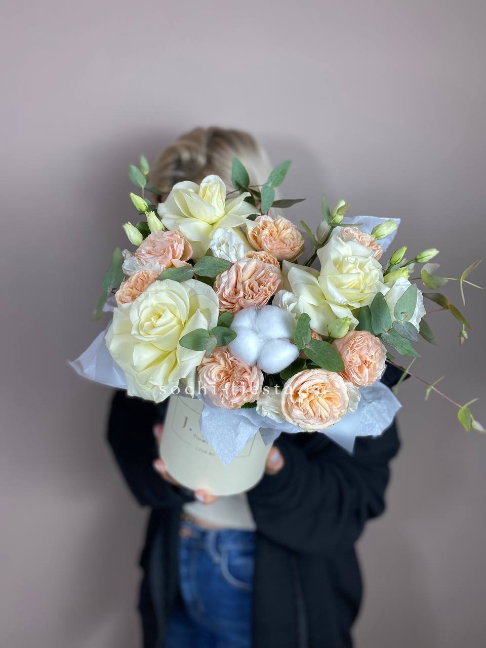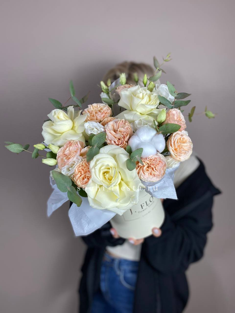Двадцать пять пионовидных кустовых роз с коробочками хлопка в дизайнерской упаковке. Природная белизна и пышные головки создают объём с мягкими переходами.
