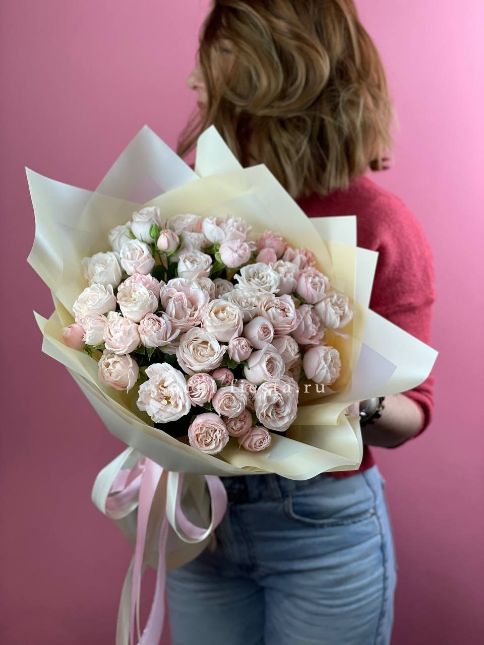 Минимальный состав: 35 пионовидных кустовых роз Мисти бабблс, лента, авторское оформление.