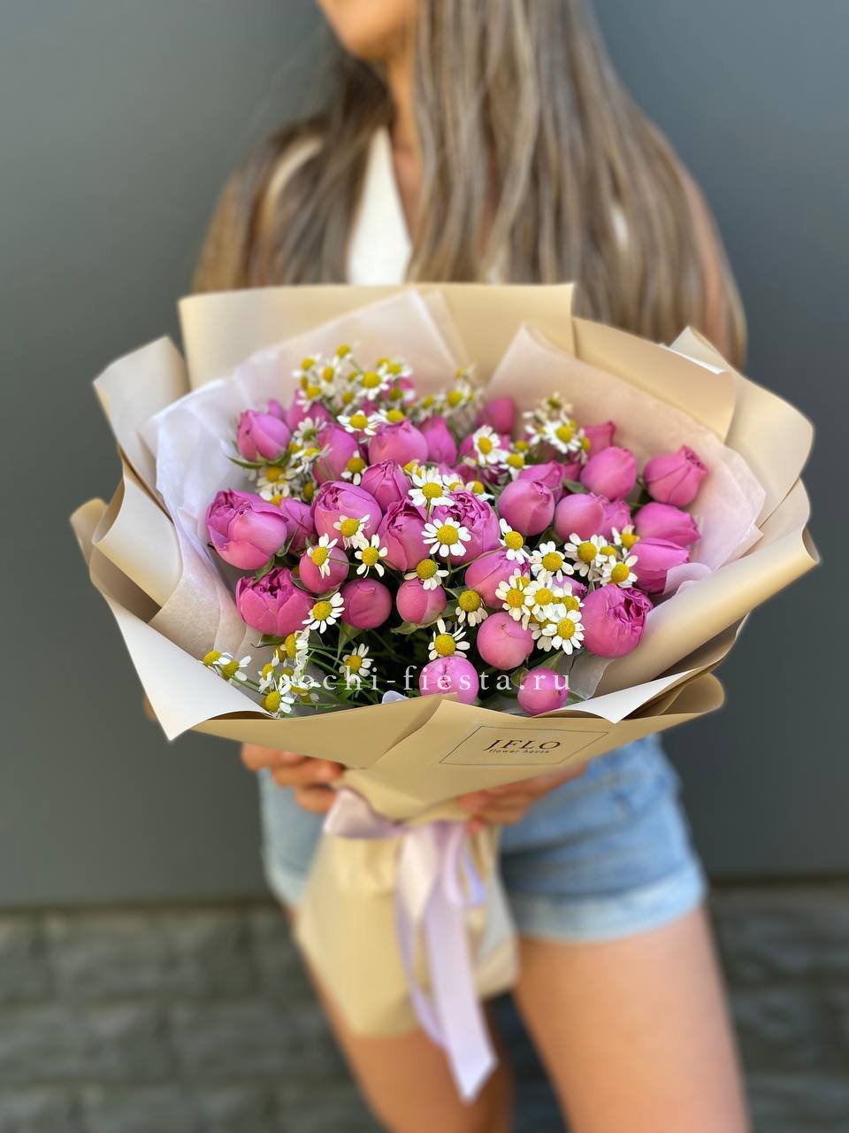 кустовые розы мисти бабблс, ромашки, лента, упаковка.