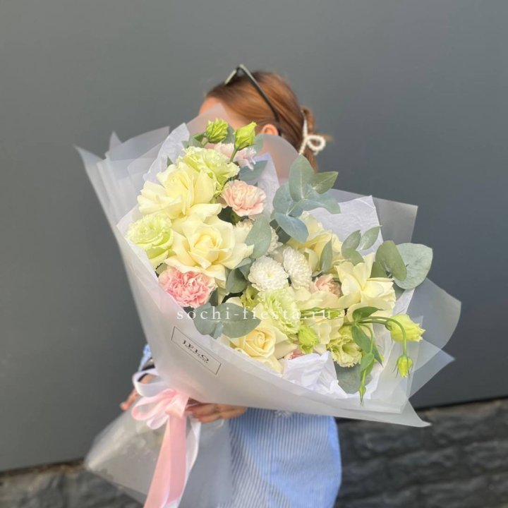 Основа сборных букетов в Калининграде: розы (Freedom, Mondial, Avalanche), хризантема кустовая, альстромерия, эустома, фрезия, вероника. Дополнительно — ранункулюсы в сезон, хризантема одиночная, ирис весной, тюльпаны в апреле. Состав зависит от текущей поставки и сезона. Флорист всегда предлагает то, что в лучшей форме прямо сейчас.