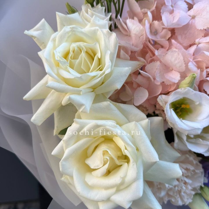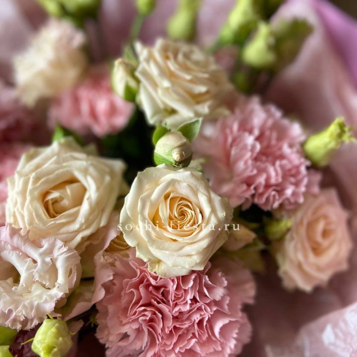 Основа сборных букетов в Калининграде: розы (Freedom, Mondial, Avalanche), хризантема кустовая, альстромерия, эустома, фрезия, вероника. Дополнительно — ранункулюсы в сезон, хризантема одиночная, ирис весной, тюльпаны в апреле. Состав зависит от текущей поставки и сезона. Флорист всегда предлагает то, что в лучшей форме прямо сейчас.