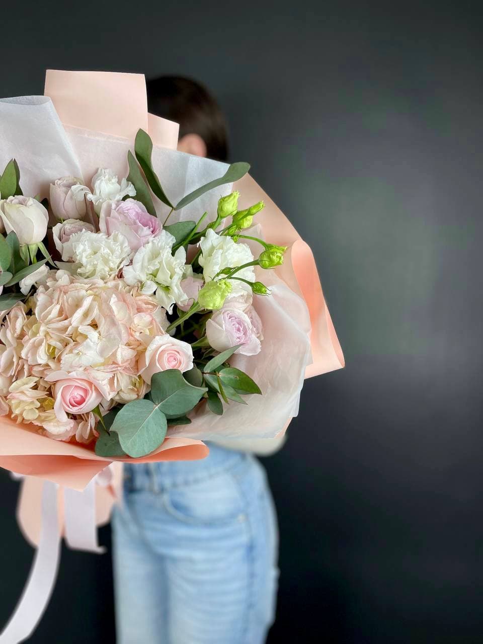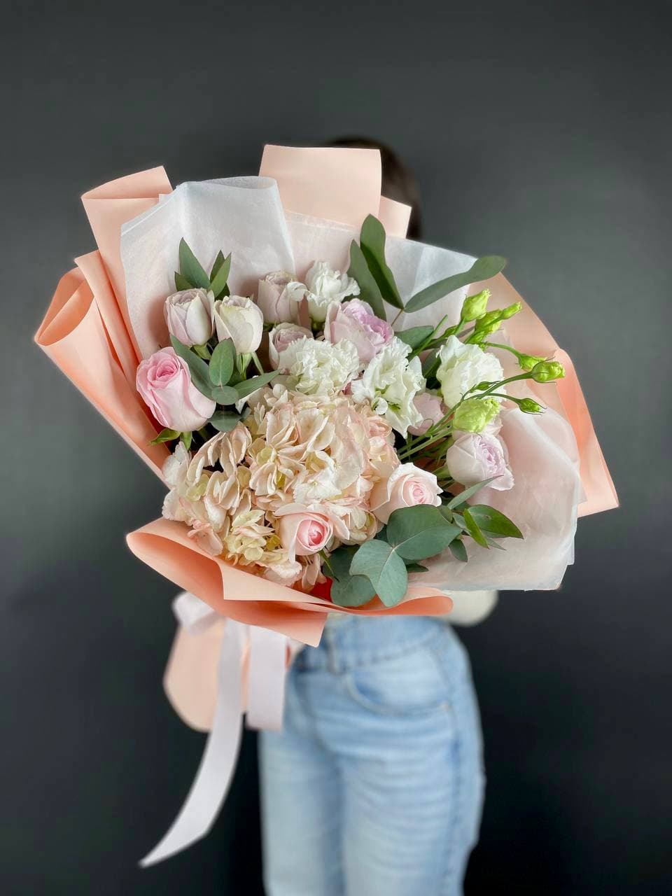 гортензия, герберы, эустомы, розы, диантус, эвкалипт, лента, дизайнерская упаковка.
