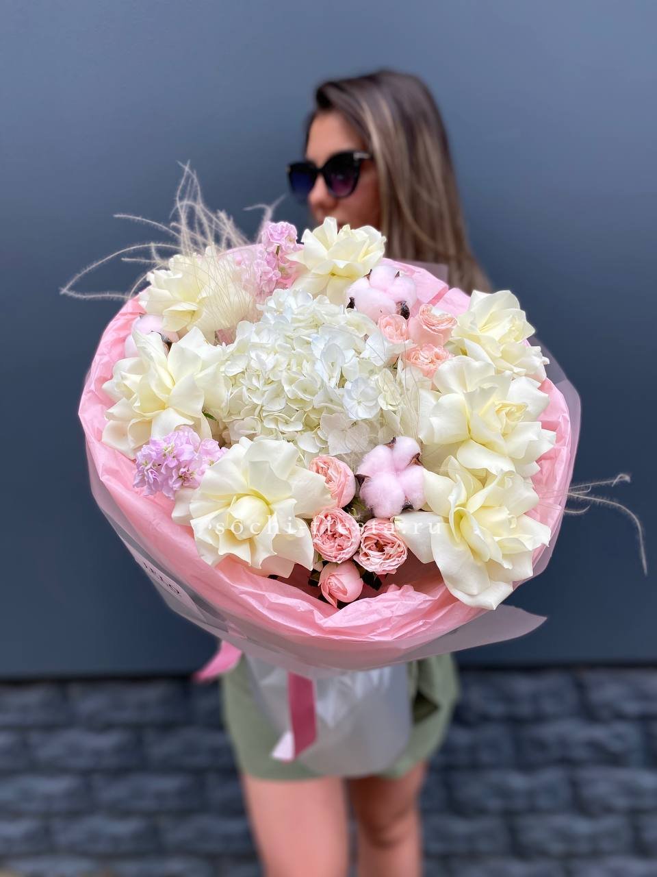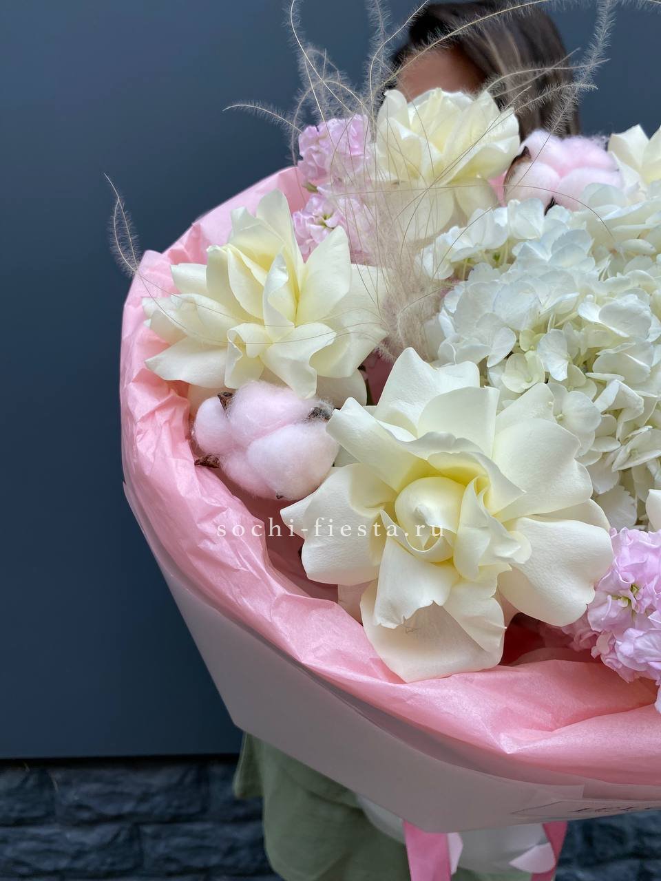 маттиола, розы, гортензия, диантусы, хризантемы , лента и дизайнерская пленка.