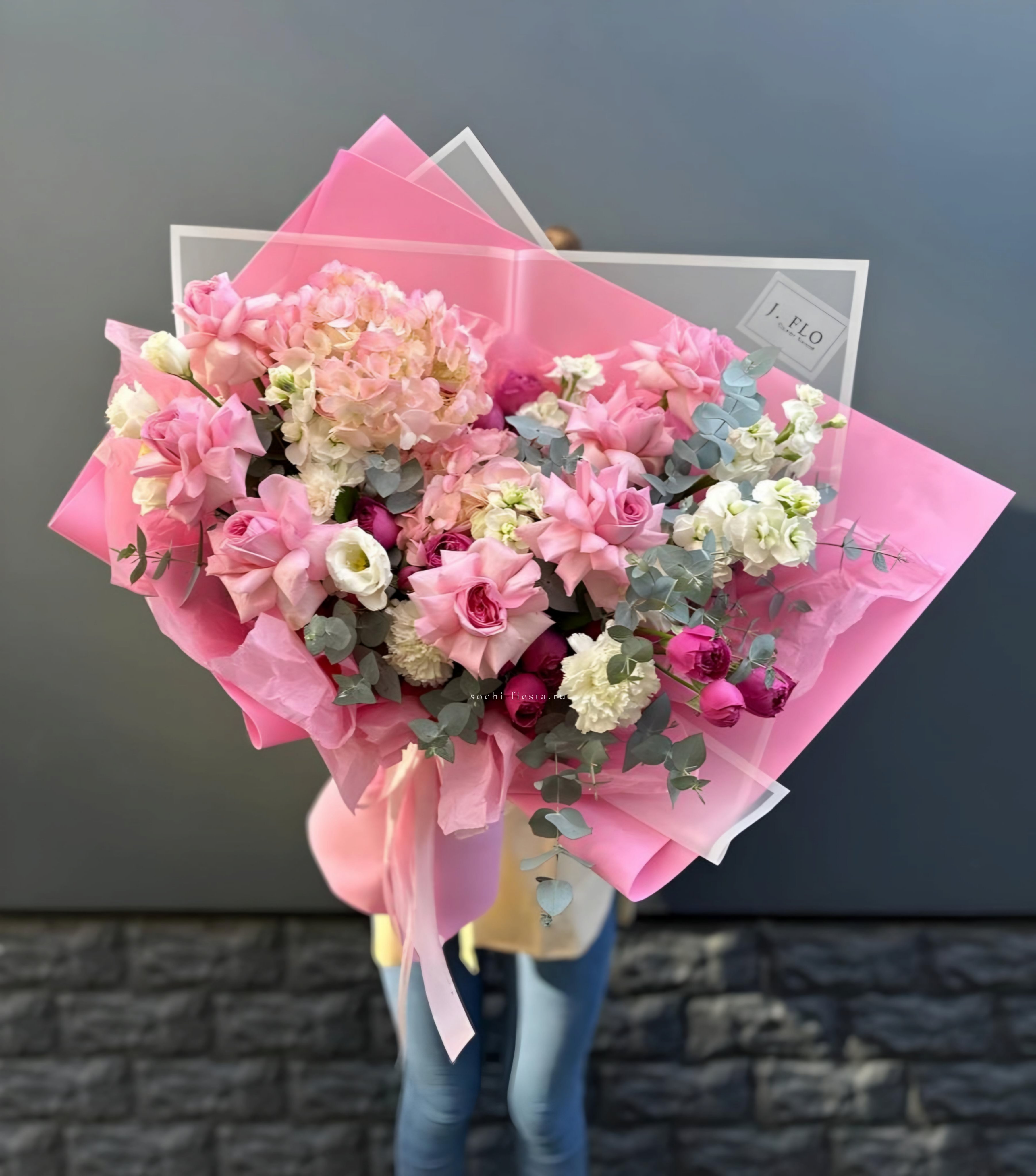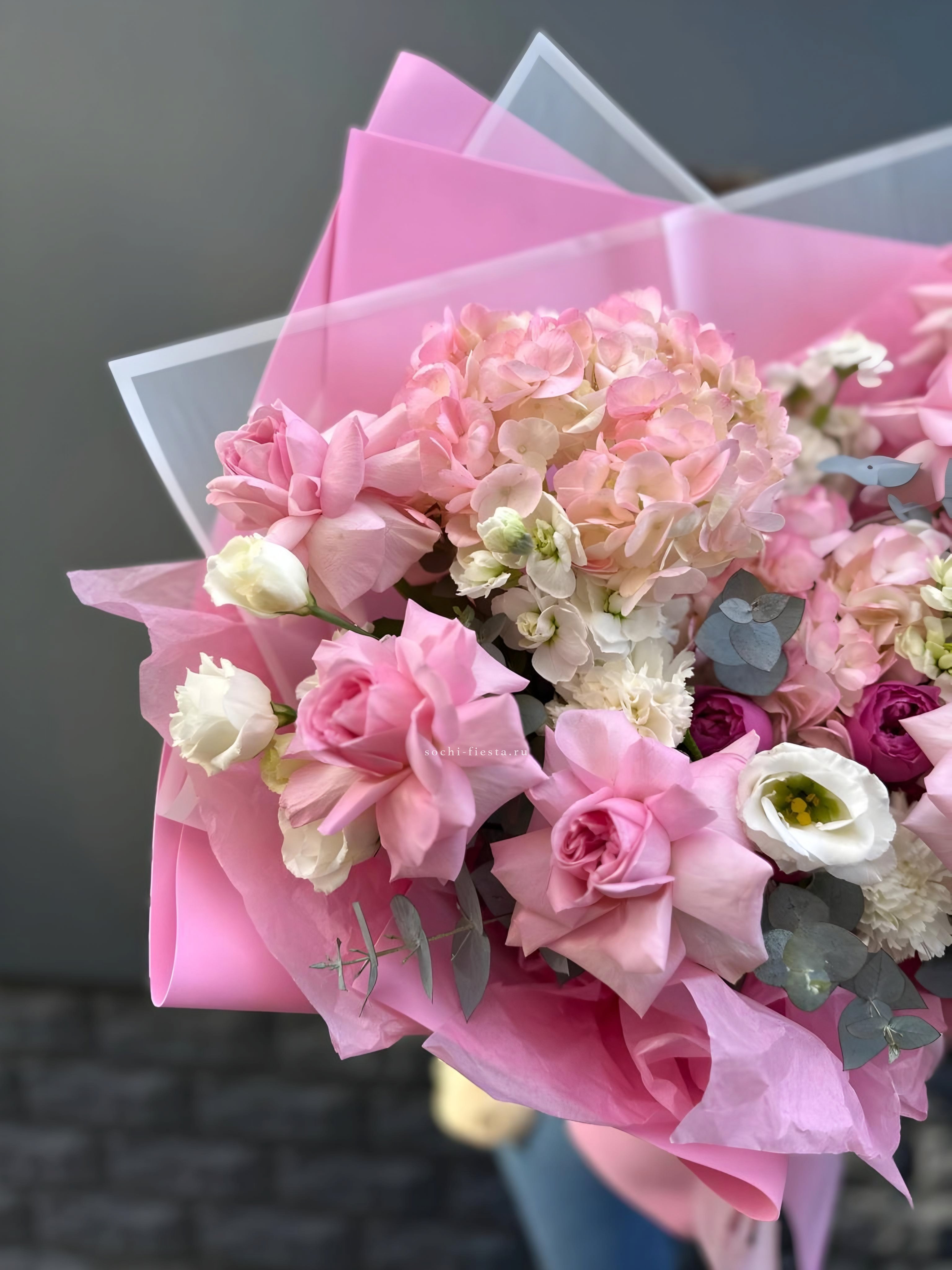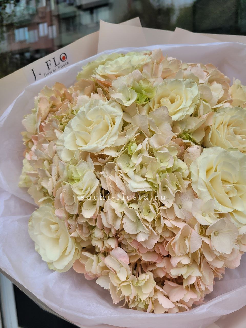 Пышные шапки гортензии создают воздушный объём, а белые розы добавляют графичности. Букет держит форму и легко размещается в любом пространстве.