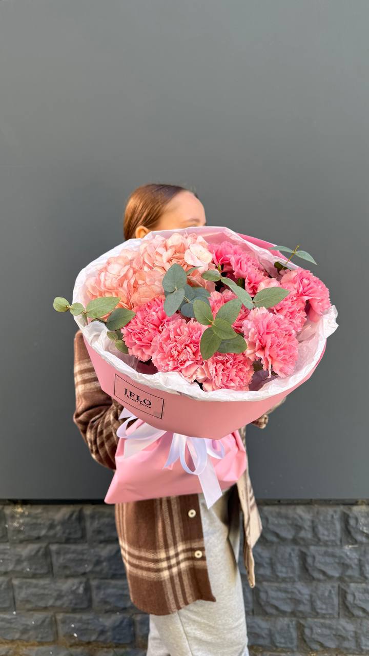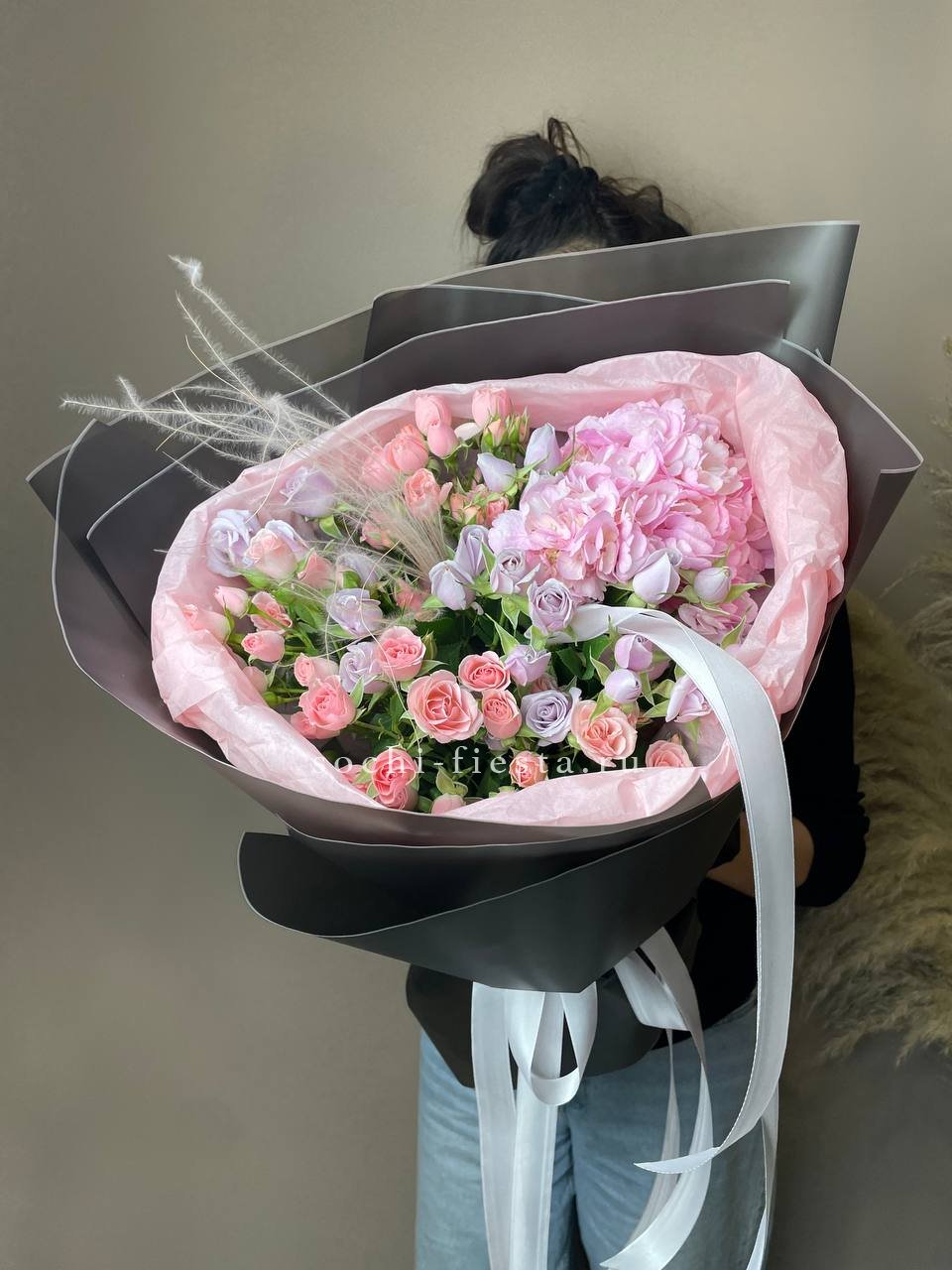 гортензия, хризантема, хамелациум, гербера, мисти баблс, диантус, пленка.