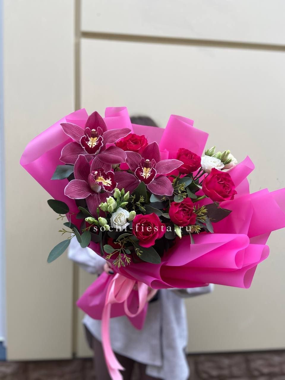 Плавные линии соединяют розы и орхидеи в единую волну. Эустома добавляет воздушности между крупными бутонами, а эвкалипт создает графичный каркас по краям композиции.