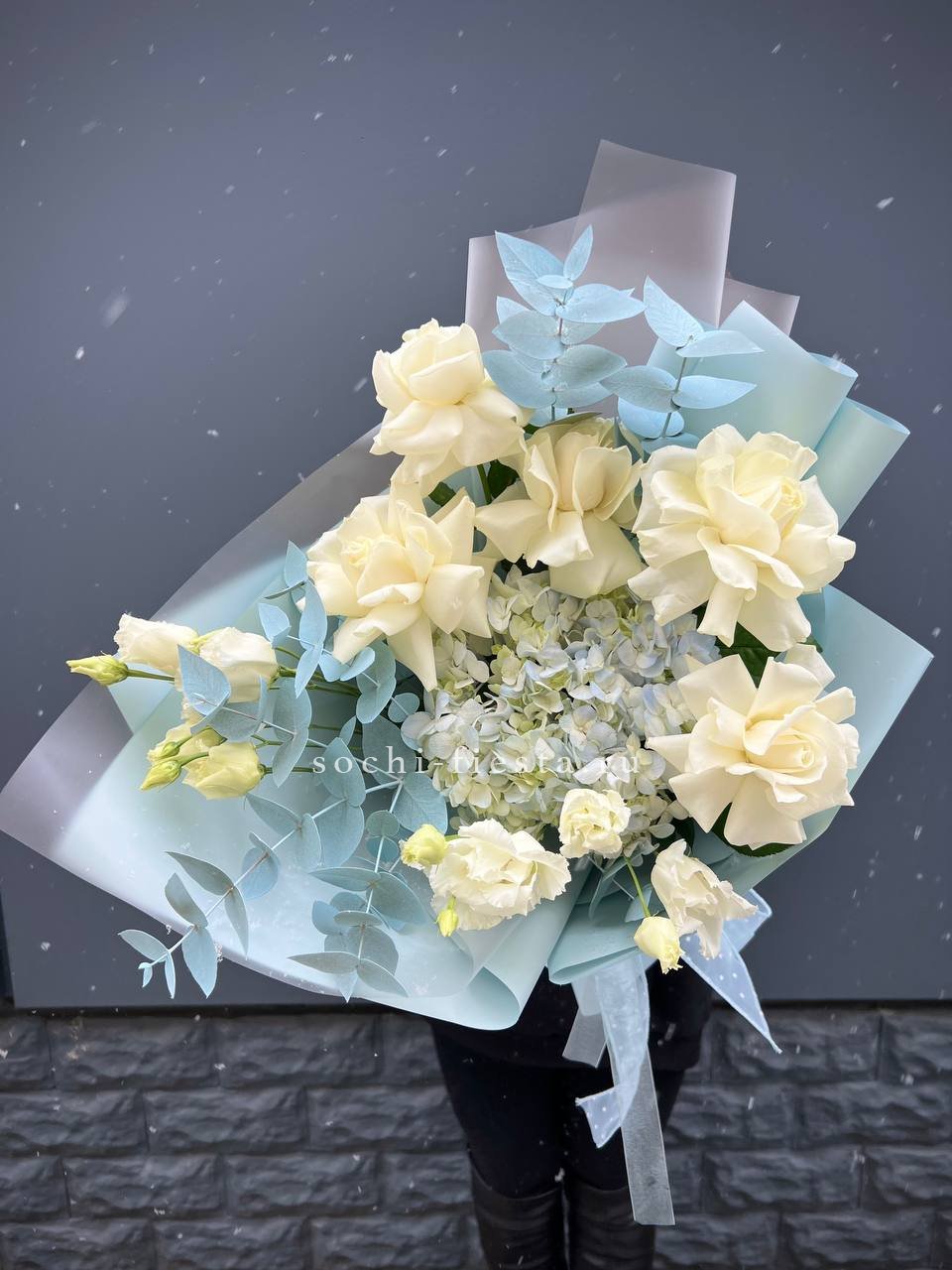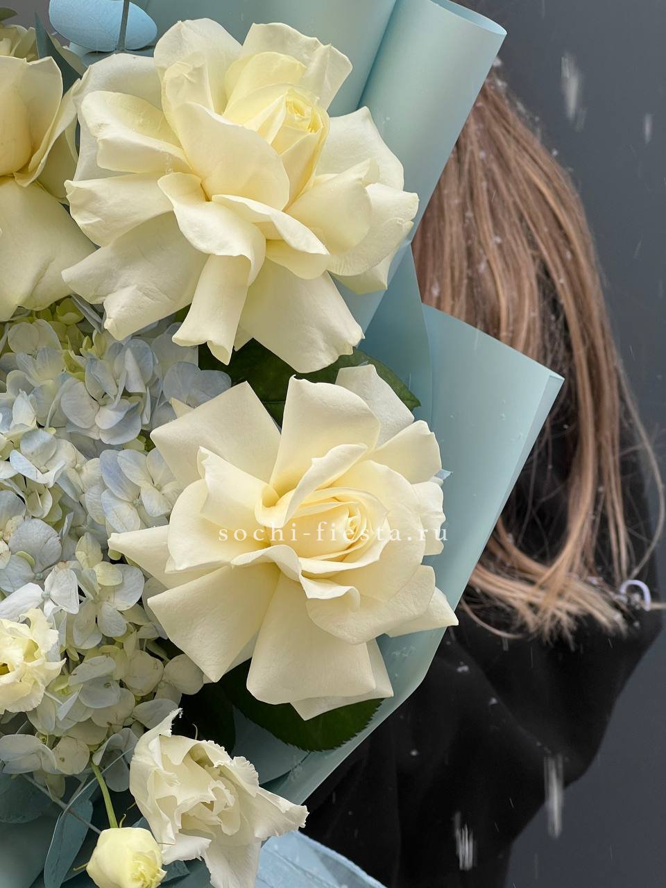 гортензия, белая роза, диантус, хризантема, эустома, озатамус, пленка.