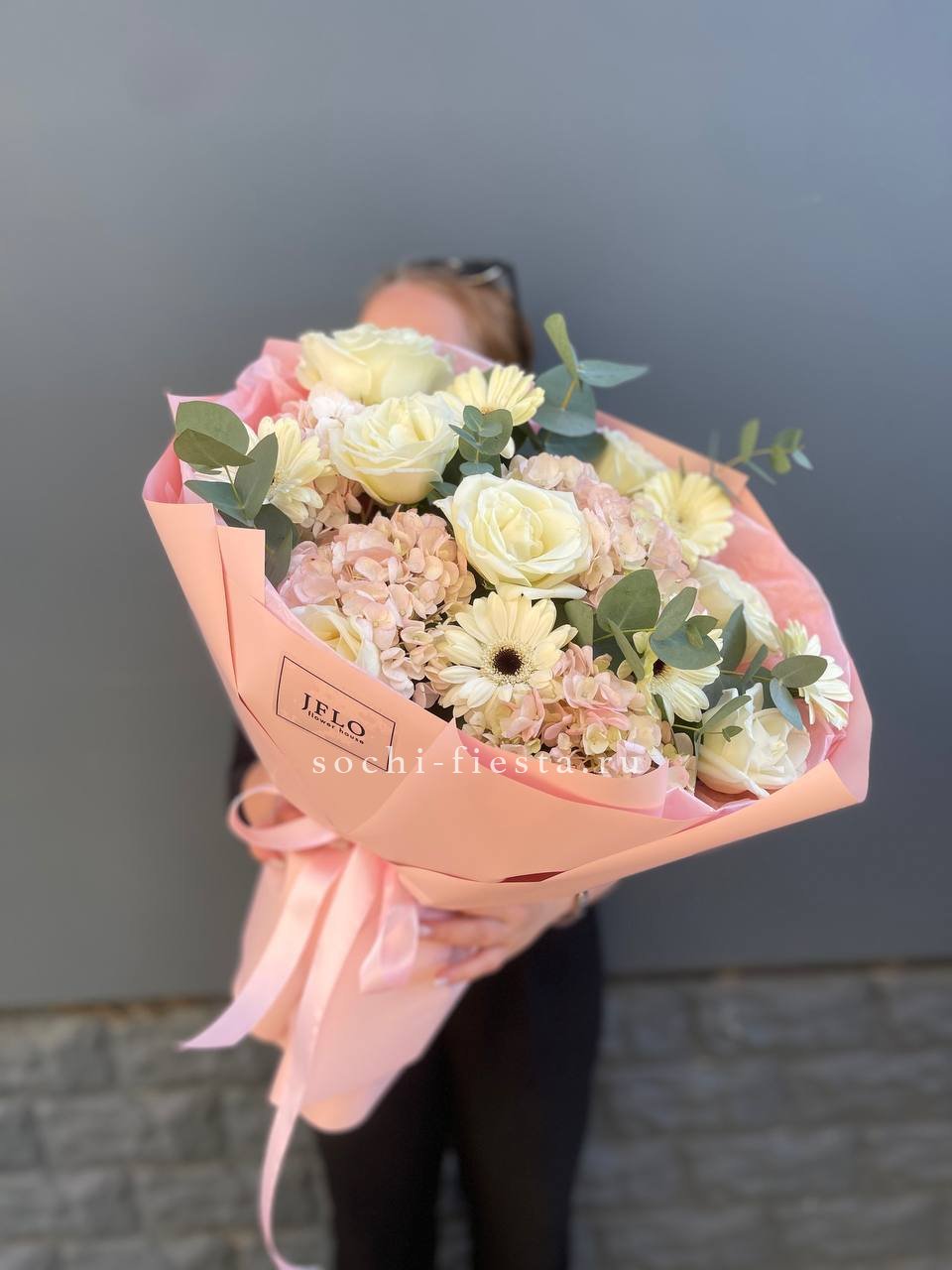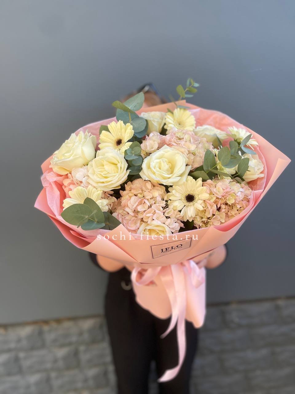 Воздушная композиция с крупными соцветиями гортензии и пышными розами создает ощущение легкости и объема. Эвкалипт добавляет свежести, а бомбастик расставляет яркие акценты между бутонами.
