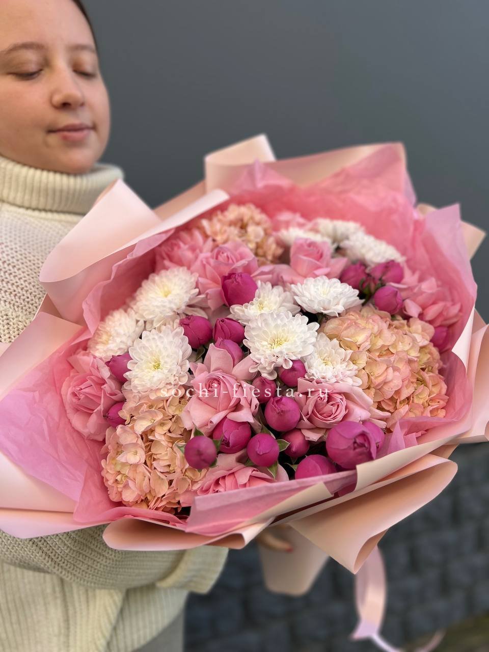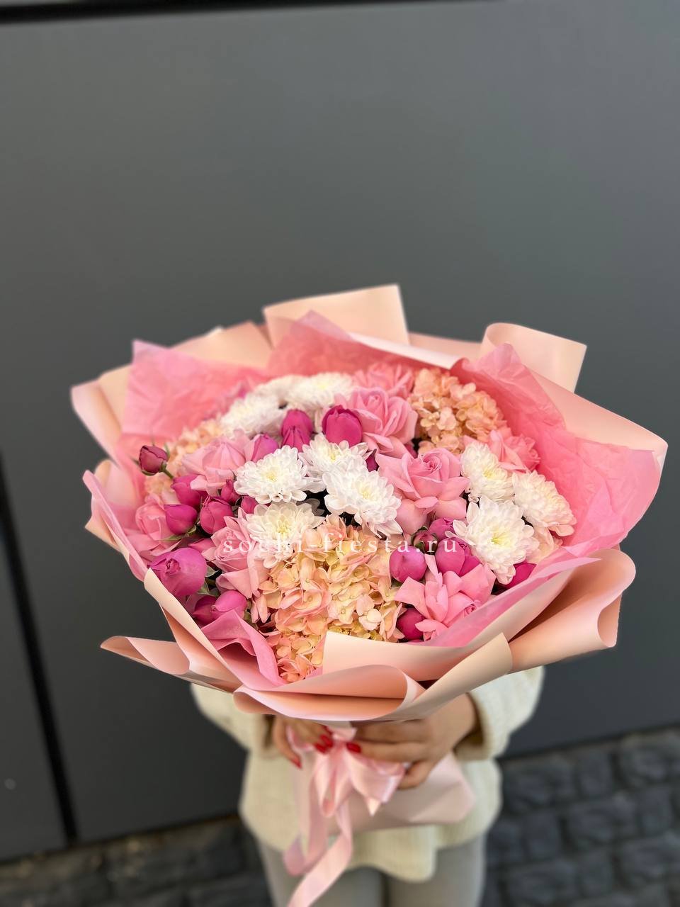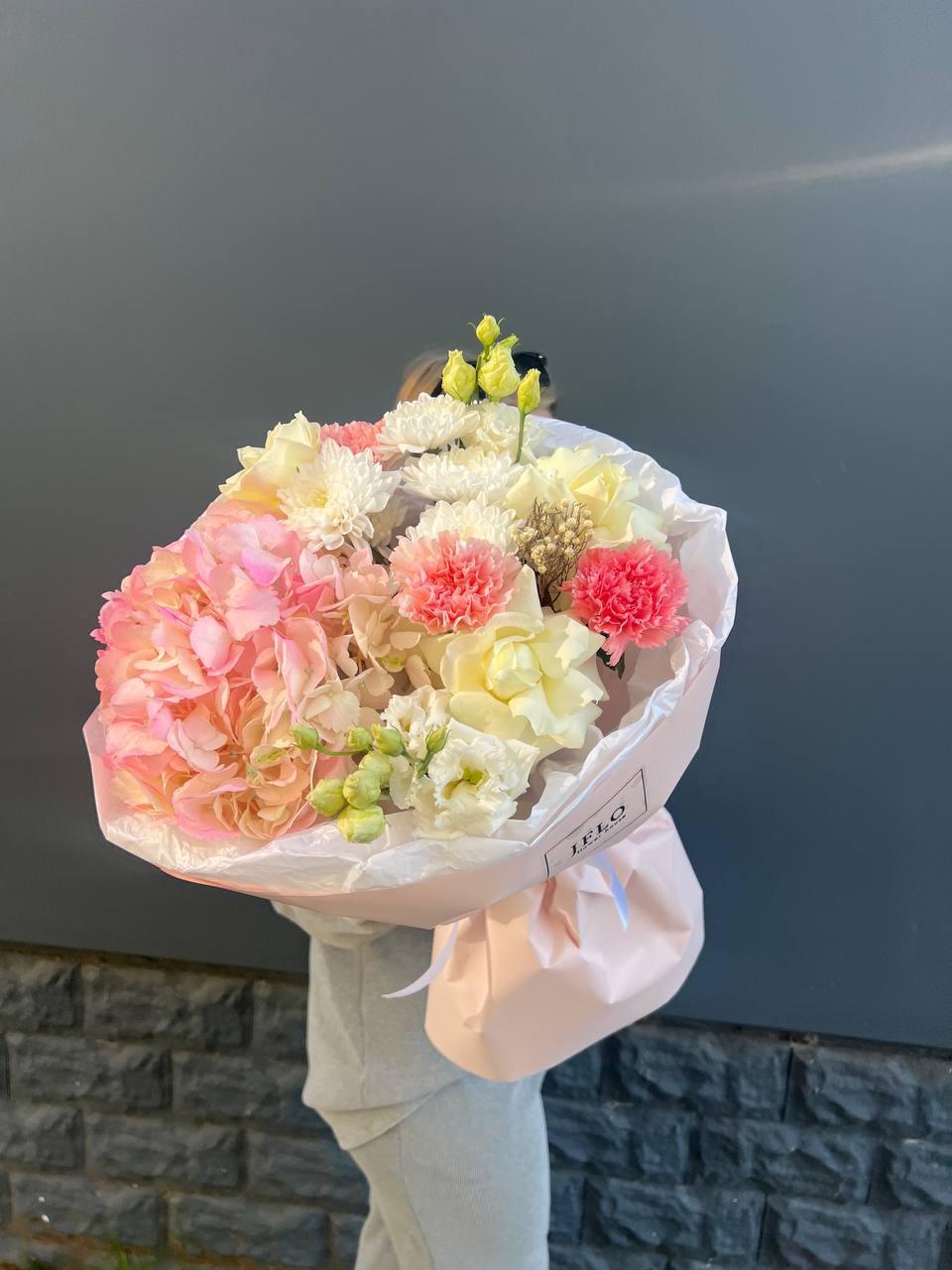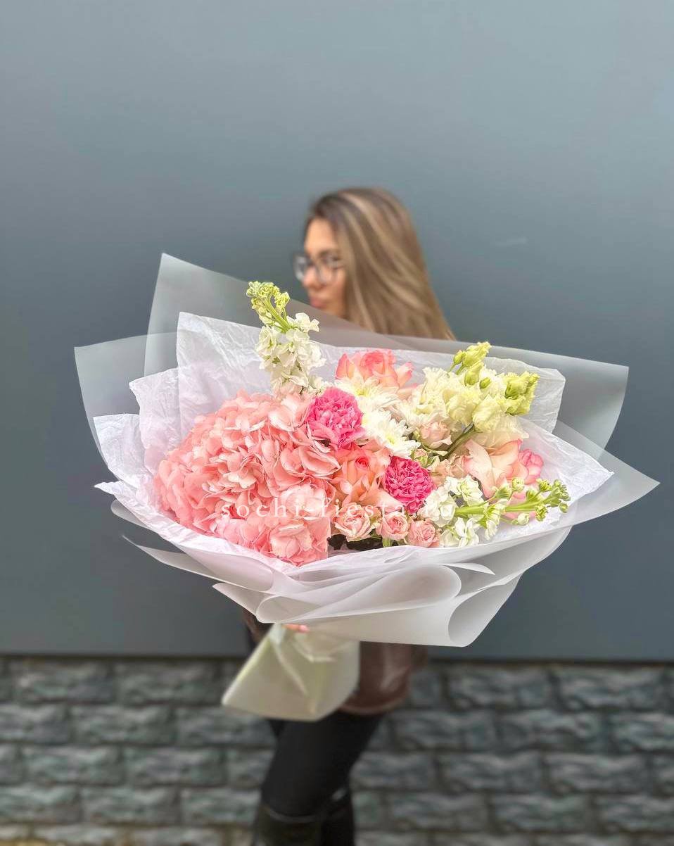гортензия, французские розы, маттиола, лимониум, дианстусы, эвкалипт, ковыль и дизайнерская упаковка.