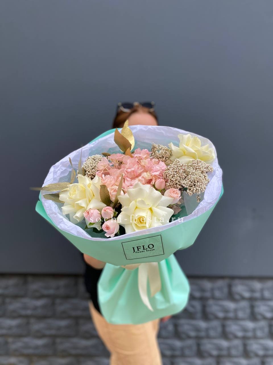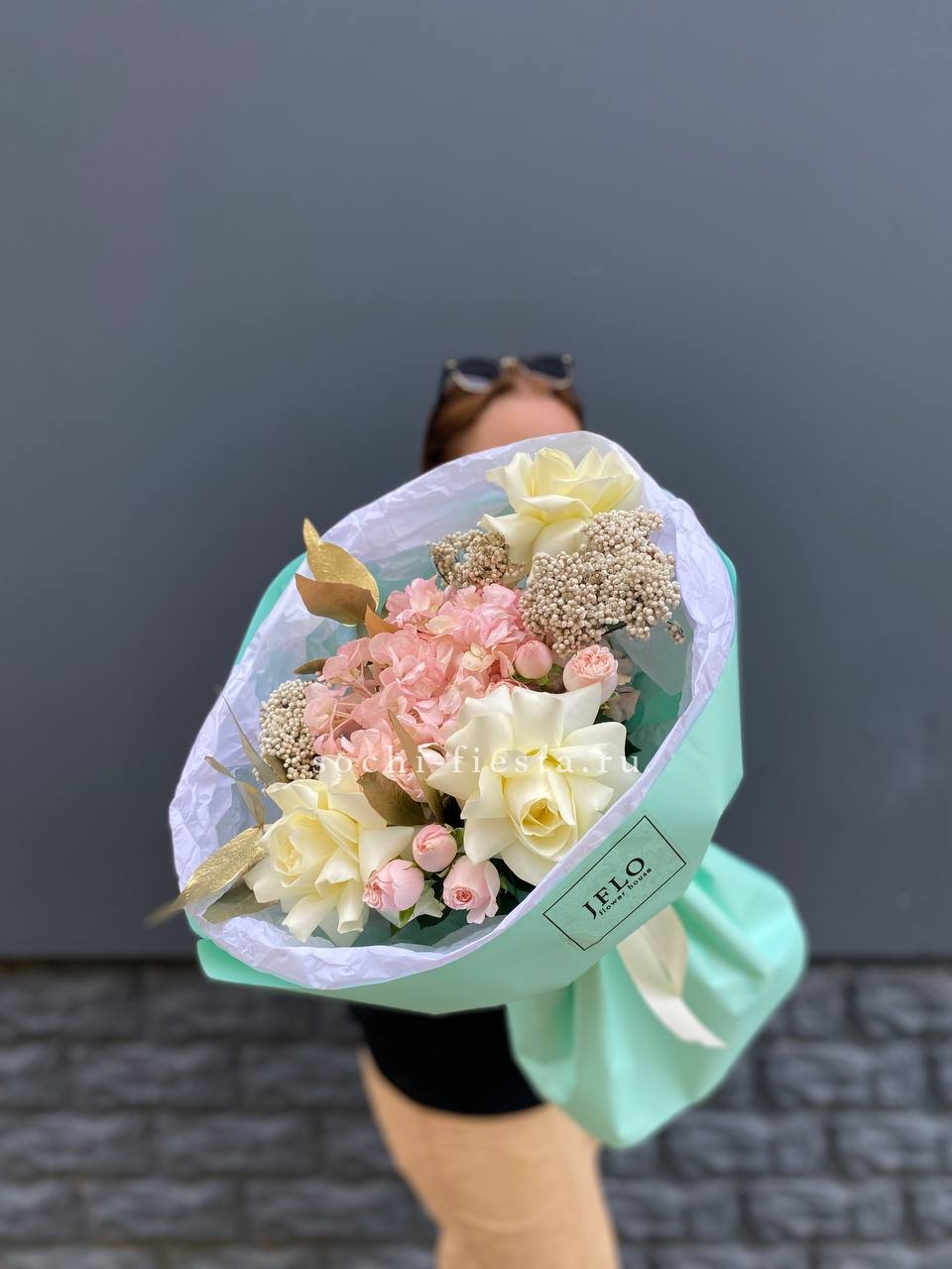 Гортензия задаёт пышную основу, а маттиола и лимониум наполняют букет текстурной глубиной. Французские розы и ковыль создают динамику, которая оживляет композицию и придаёт ей выразительность.
