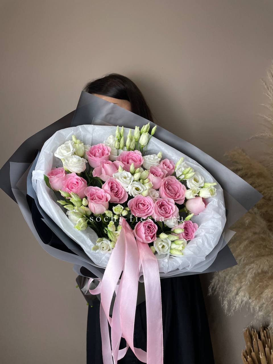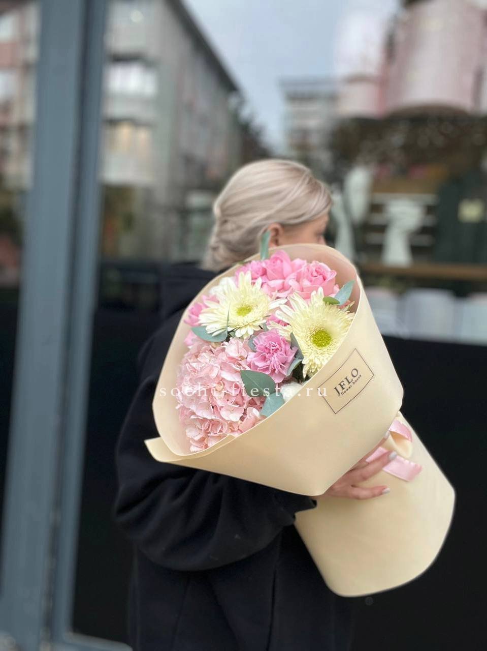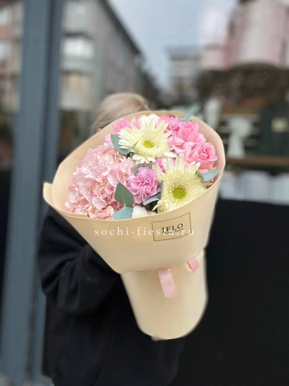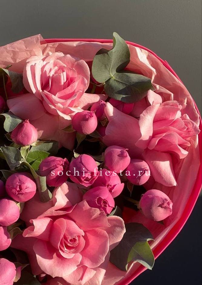 гортензия розовая, розы одноголовые, эустома, эвкалипт, лента, дизайнерская упаковка.