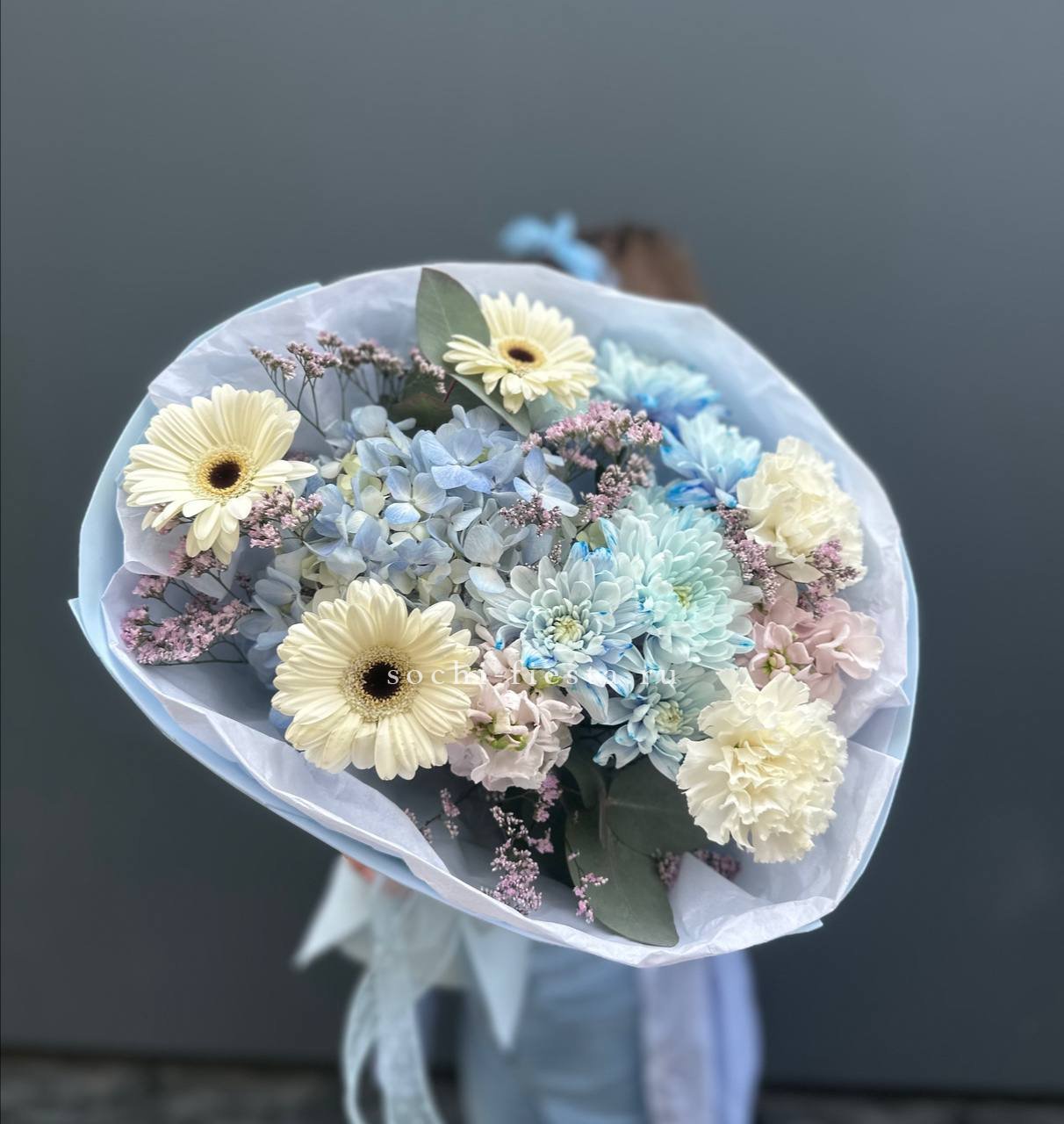 Пышная гортензия задаёт мягкий объём, а розы и эустома создают воздушную текстуру по краям. Веточки эвкалипта добавляют свежести и завершают композицию естественными линиями.