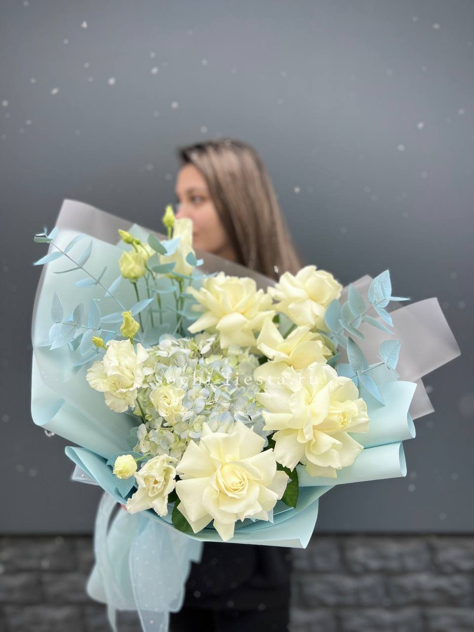 Белые французские розы с пышной гортензией и эустомой образуют воздушную композицию с мягкими переходами оттенков. Эвкалипт добавляет свежести и завершает форму.