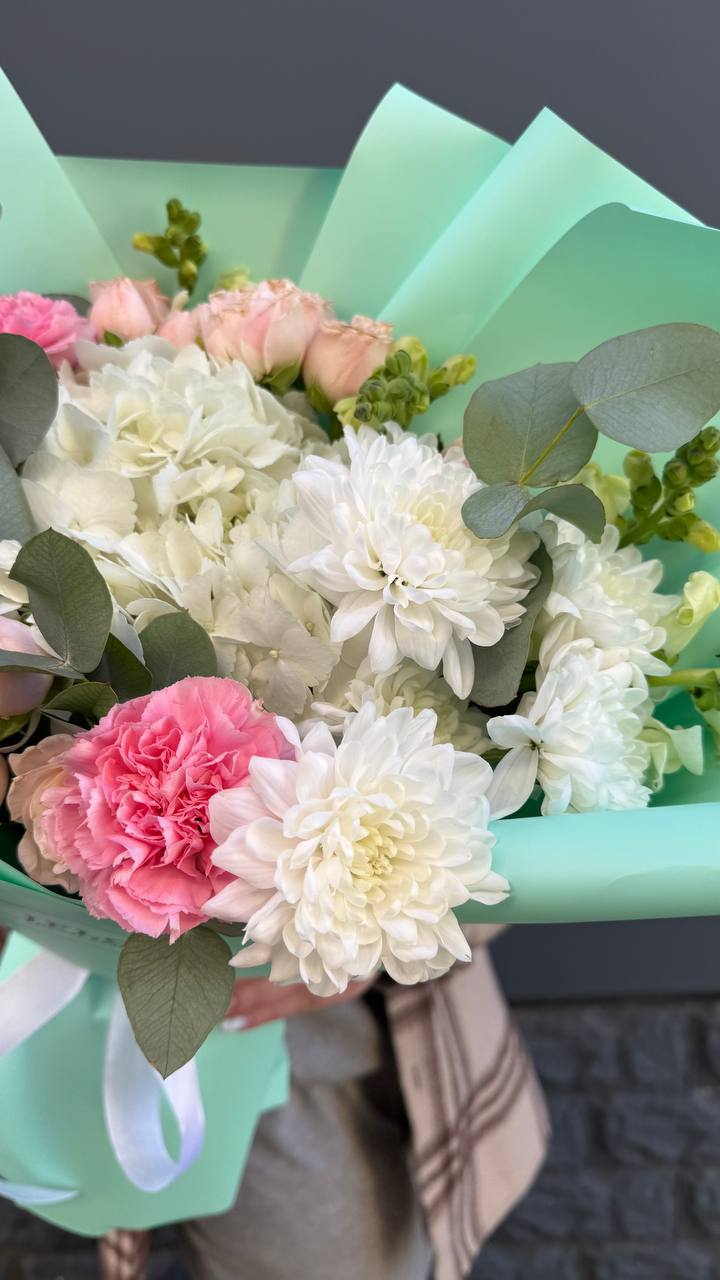 Хризантемы держат форму долго и остаются свежими даже в жаркие дни. Диантус и антиринум добавляют сборной композиции разнообразия без лишних деталей. Воздушная упаковка сохраняет аккуратный вид.