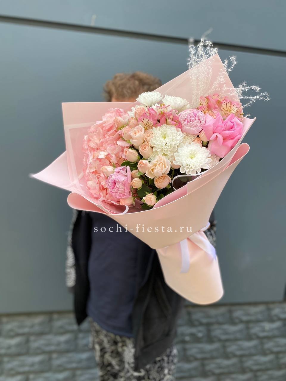 Пышные пионы и воздушные гортензии образуют объёмную композицию с живописной структурой. Кустовые розы и альстромерии добавляют букету плотности и заполняют пространство между крупными соцветиями.