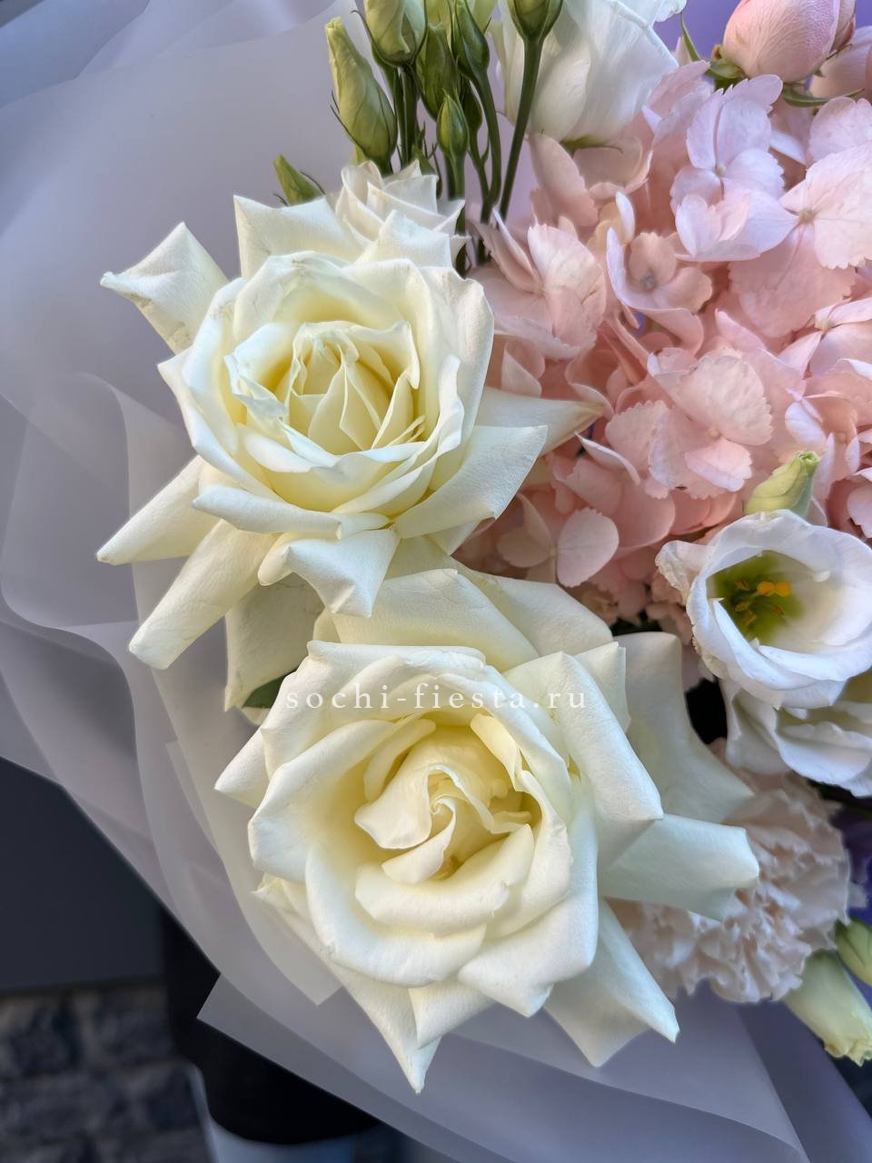 гортензия, розы, диантусы, хризантема, пионы (или пионовидные розы), эустома, корзина. Состав может меняться, в зависимости от сезона.