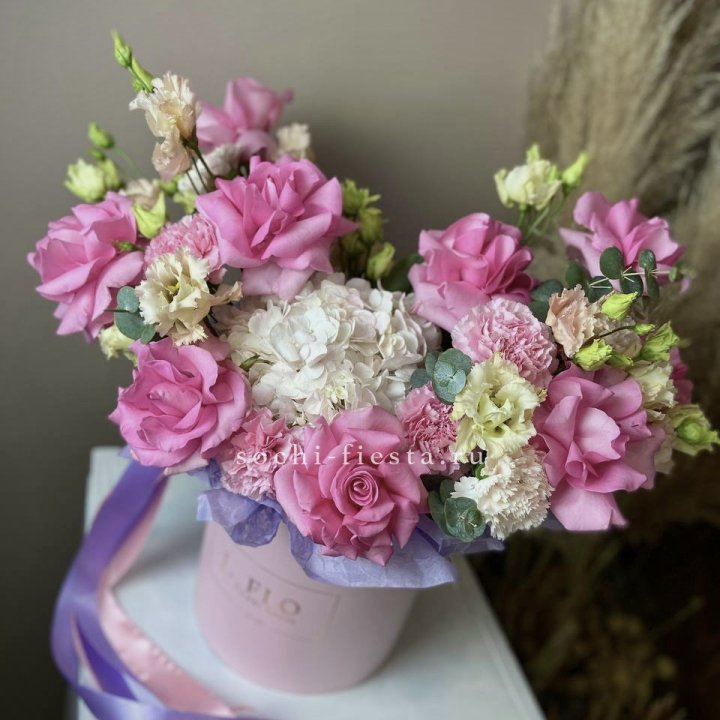 • Шляпная коробка с розами и гипсофилой — универсальный подарочный формат.